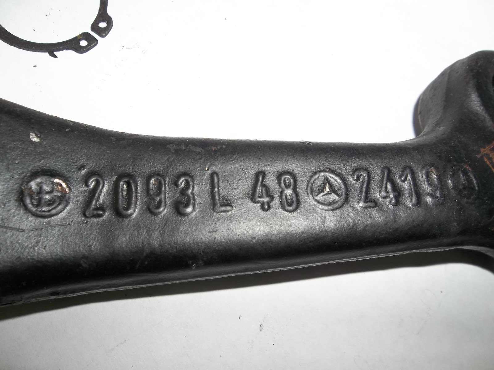 THIS IS THE LATER STYLE USED ON 300e AND OTHER CARS \*\*NOTE IT HAS LARGER HOLE FOR DRAG LINK #2093 L 48 2419 from a 124 series car 2093 L 48 2419 MERCEDES PART# USED ON LATER 300e FROM THE 89- LATER \*\*\*YOU MUST MATCH UP # AS THE EARLIER ARMS HAD SMALLER DRAG LING HOLE INCLUDES THE NUT & BOLT WITH METAL RING RETAINER