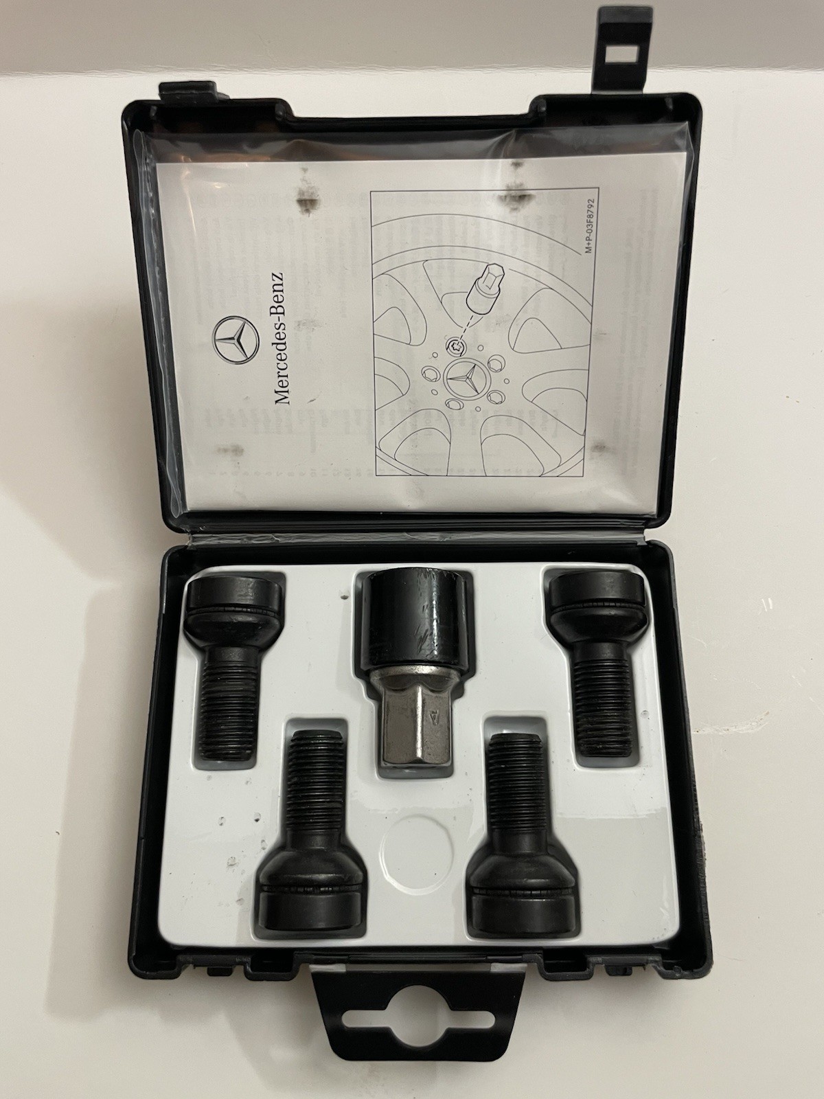**1 - SET OF MERCEDES FACTORY WHEEL LOCKS WITH CASE.** **• ORIGINAL OEM PART.** **• 14x1.5 THREAD. SHORT LENGTH BOLT NOT LONG BOLT.** **• 4 BOLTS WITH KEY AND CASE.** **WHEEL LOCKS ARE USED IN WORKING CONDITION.** **ALL LOCK KEYS ARE DIFFERENT. DO NOT TRY TO MATCH KEY.** **PICTURES ARE STOCK PHOTOS.** **FREE SHIPPING U.S. ONLY.**