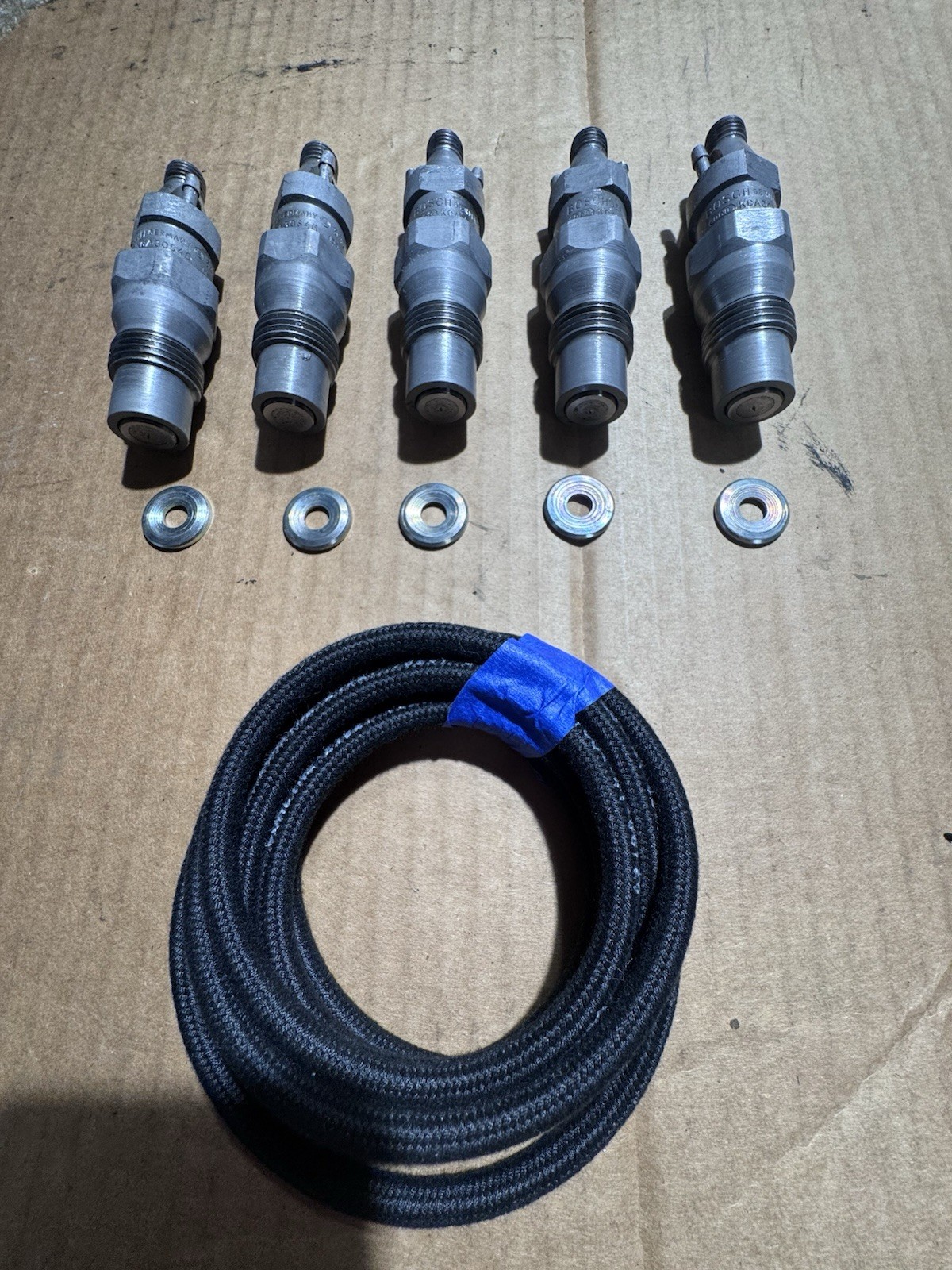 **Mercedes W123/116 (OM617) BOSCH GERMAN MADE FUEL INJECTORS and BOSCH (060) STUTTGART DNO SD 240/ NOZZLES REFURBISHED** **Considered by many to be the best diesel fuel injectors made … vintage Bosch Stuttgart (coded (060) holders and nozzles…** **UNUSED SINCE BEING REFURBISHED…** **Injector change is definitely the best step to make your Benz run better if you are running on old injectors…** **These vintage GERMAN MADE BOSCH turbo fuel injectors were disassembled… meticulously cleaned…reassembled with German Bosch DNO SD240/ (forward slash) nozzles for turbo engines and pop tested at 135 BAR for accuracy by a well known MB enthusiast (Mark B)who lives in South Carolina. He has refurbed multiple sets for me and others and comes highly recommended…I would not use anyone else.** **EVERYTHING IN THE PIC IS INCLUDED…. 1 meter braided return line… and 5 new heat shields** **Ready to be installed…** **You will NOT be disappointed…**
