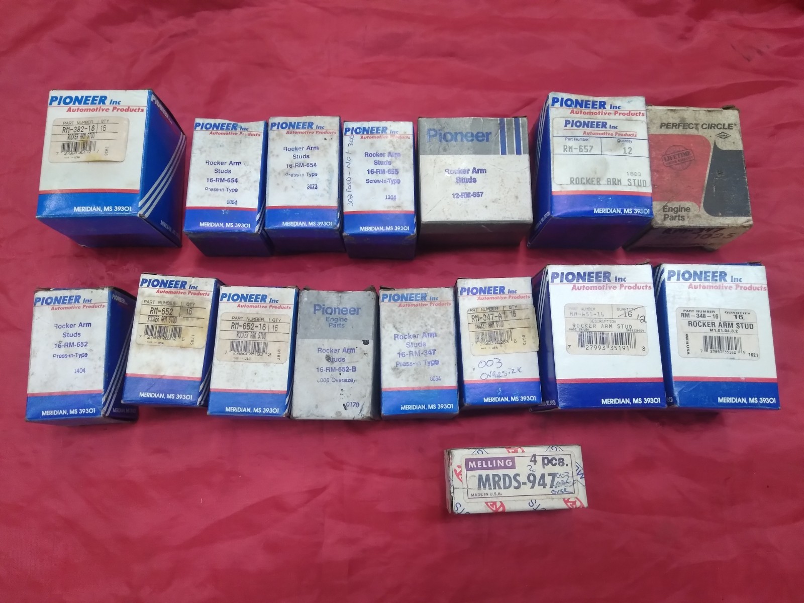 Misc lot of rocker arm studs. Boxes are not all full. I have removed the contents of each box so you can see the quantities. Mostly Pioneer brand. The boxes have shelf wear. I dont know what all the part numbers fit. There are few for an oversize press fit.