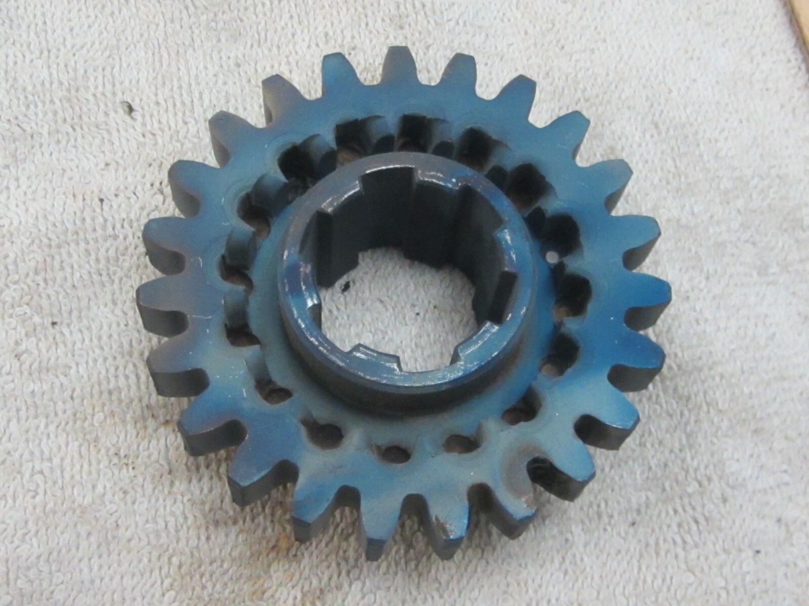 This is the large sliding gear. Original foundry marks on side purple color is from warming after bead blast to prevent rust. Sliding gears are from same transmission. I see only minor wear and only very minor pitting, have to look very hard to find it. Please look at photos closely and feel free to ask questions, selling as is and only ship to USA address.