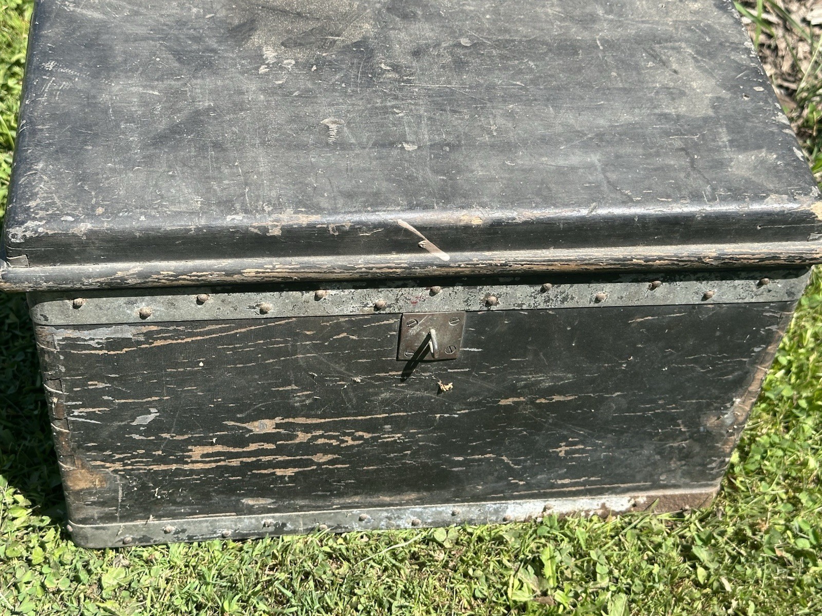 Nice tool box. I don’t know who made it. I was told it was on a model T running board. Mice chewed around one of the holes on the back. Photos show condition of bottom board.