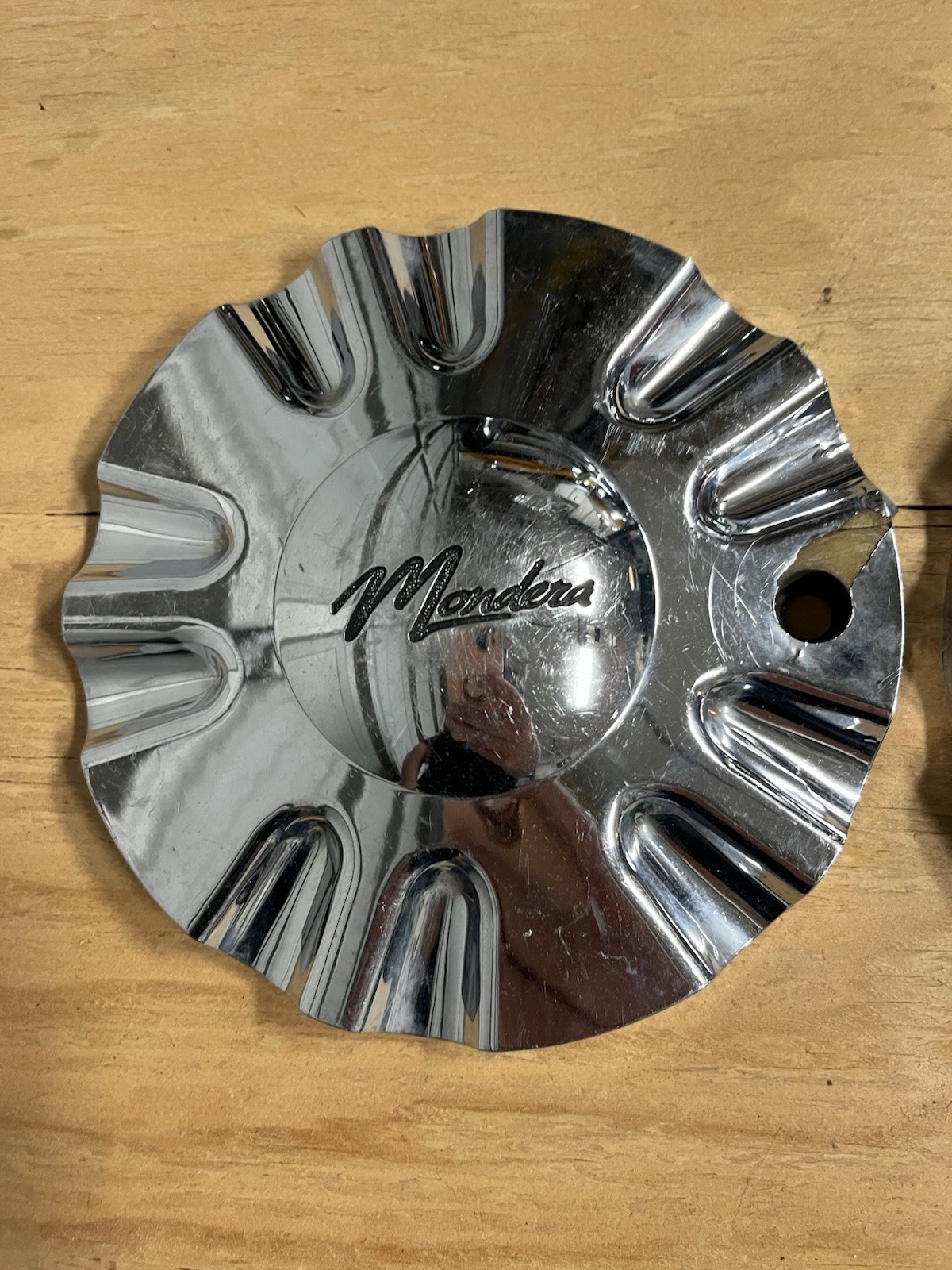 2 for $22 These are Chrome Wheel Center Caps that are used and abused, what can I say, look at the pictures. Have Mercy!! On the other hand, decent enough to work on your MONDERA wheels because these are MONDERA center caps. They have some chrome peeling, scratch marks, also both mounting tabs DO have small cracks, one more than the other. I took many pictures so we are on the same page. Thank you very much
