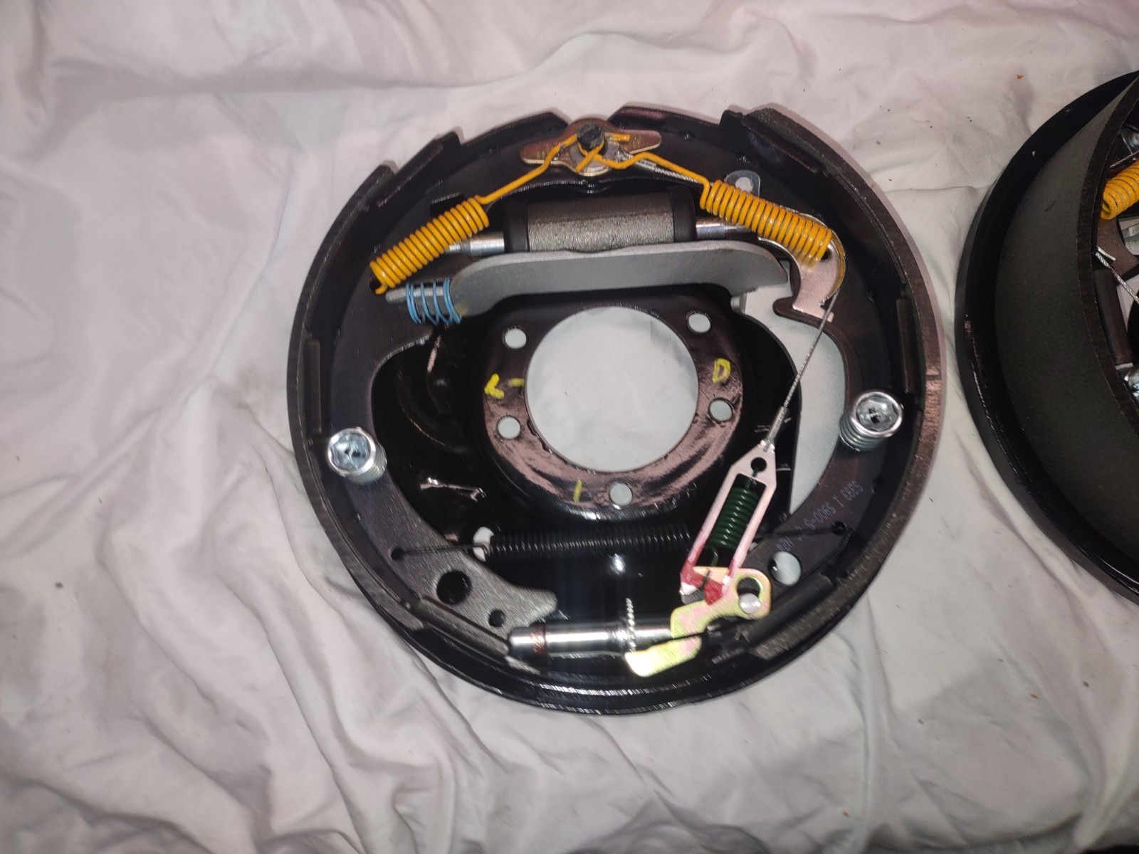 This is a set of rear driver's and pass side as marked 8.75 5 on 4 1/2 10 x 2.5 with new brake shoes .and new spring kit and wheel cylinders self adjuster kit and used emergency brake arms primed and painted and used struts primed and painted struts .plates are originals that have been cleaned and eich primed and painted black .the plates are a.nice clean set originals see pics if have questions please ask thanks Craig The drums for these can be bought at your local parts store if you need part number just ask thanks again