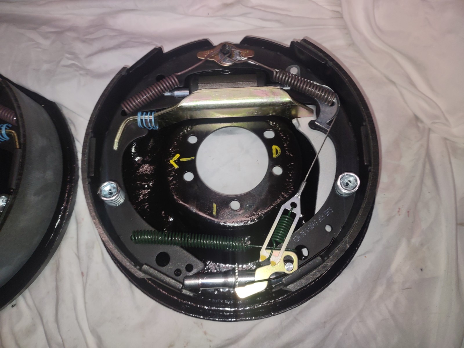 This is a set of rear driver's and pass side as marked 8.75 5 on 4 1/2 11 x 2.5 with new brake shoes .and new spring kit and wheel cylinders self adjuster kit and new emergency brake arms primed and painted and new struts primed and painted struts .plates are originals that have been cleaned and eich primed and painted black .the plates are a.nice clean set originals see pics if have questions please ask thanks Craig The drums for these can be bought at your local parts store if you need part number just ask thanks again