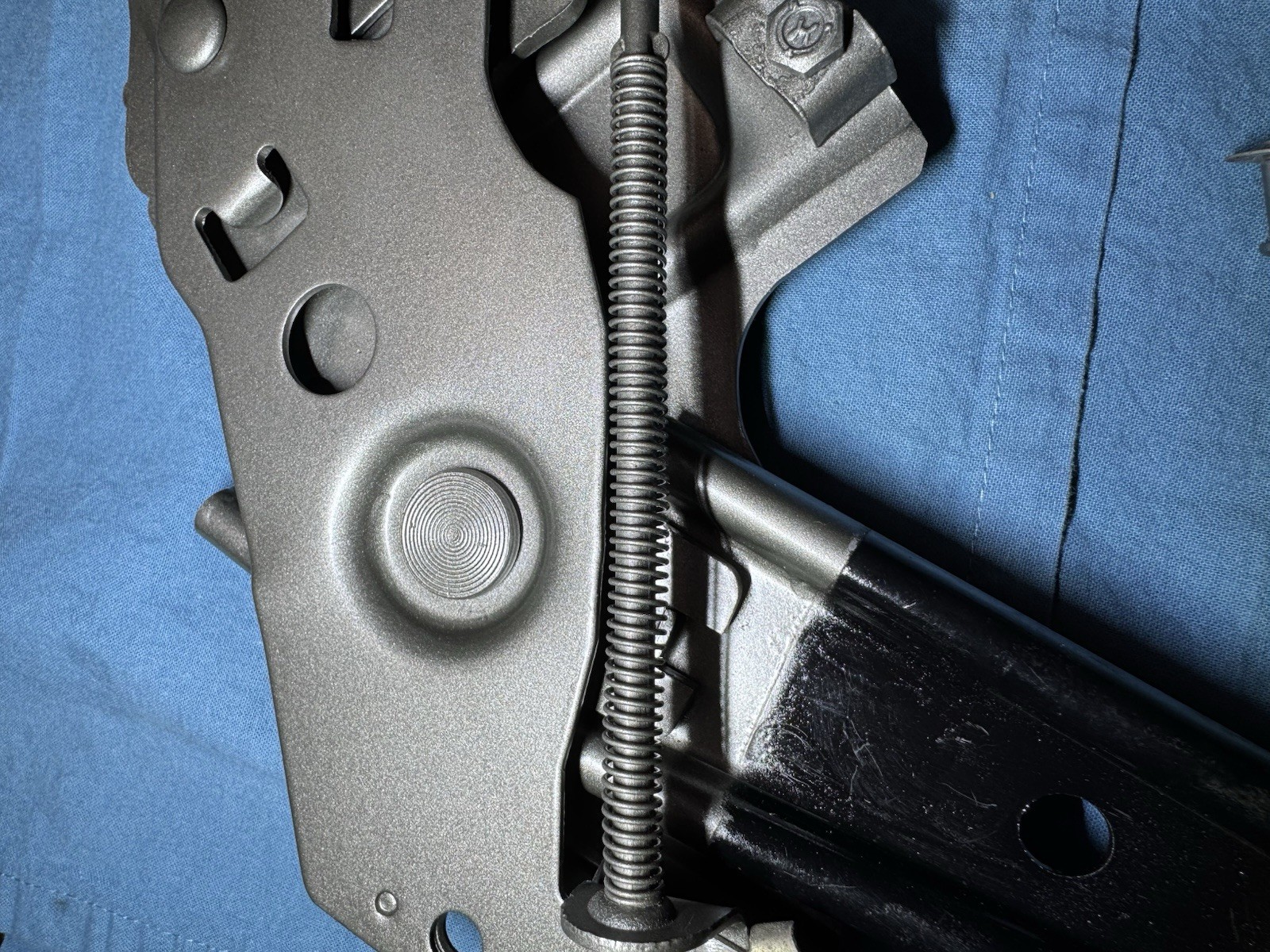 1966-1970 Mopar B body parking brake mechanism. It has been sandblasted and repainted with cast iron paint and also gloss black paint. This parking brake has no date code. But it was removed from a 1968 Plymouth Roadrunner. The parking brake is functional. The black paint is not perfect as it has runs and scratches on it so look at the pictures to see that. It takes multiple hours to restore the parking brake to make it look like this along with hours to remove it from the car. This parking brake works on 1966-1970 B-Body cars. The only difference if any is that some 1966 B Body cars had a chrome pull release knob instead of a plastic one and also no indicator sending unit, which is just bolted on with a small bolt. If you use it on a 1966 car that doesn’t require an indicator sending unit then you can simply remove the screw and take it off. Both of the studs are original and have not been replaced. Two oem nuts and one bolt is provided to mount it. The hard to find mounting pin for the parking cable connection is provided. The release handle is a used plastic original one. The rubber pad is from a 1966-1970 model car and has some cuts in it on the back side and sides, it can be replaced with a new one if you decide to go that route. The pictures show the condition and what is included so please look at them before you decide to buy the part. No parking brake cable is provided. If you do not want to buy this item do not buy it because i do not have returns. Read the description and look at the photos before you decide to buy it please. I ship this parking brake in a Priority Mail Flat Rate Box for $30.