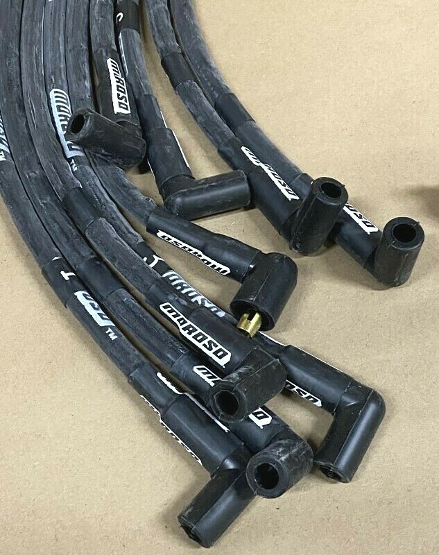 **Moroso Mag-Tune 8mm High Performance Plug Wire Set** Small Block Chevy, 90 Deg Boots (Socket style), Under Header (This set is Hi-Temp Sleeved Wires) Part # 9765M Moroso Race wire sets that out perform the competition at a price that the budget minded racer can afford! New Moroso "Mag-Tune" wire sets are a premium, top of the line ignition wire. These wires are custom fit for small block Chevy engines, designed to go under the exhaust. Socket style distributor ends (non-HEI). 90 degree boots assembled on both ends. Set also includes a 35" coil wire. The distributor end on the coil wire is unassembled, both a male and female end are included so you can use a coil with either type - socket or post connection. Made in the USA. This plug wire set starts off as their regular Mag-Tune 8mm wire and then an outer sleeve is added to protect against heat, abrasion, and the elements. They also have heat shrink tubing at each boot end and each wire is individually numbered to simplify installation. Mag-Tune Moroso wires are manufactured with a stainless nickel alloy wire which is wound 32 times per inch around a conductive latex coated, heavy fiberglass core. This conductor meets O.E. radio frequency interference (RFI) requirements while operating at one-tenth the resistance of conventional "Carbon Core" conductor. All ignition wire jacket is made from two layer EPDM (ethylene propylene diene monomer) for the best heat protection and highest dielectric strength. Layers are separated by a fiberglass reinforcing braid for added pull strength. The spark plug boots are all silicone and sure grip snap-lock terminals are used. Moroso Mag-Tune wire sets are available in both universal and custom fit applications. The custom fit applications are available with or without insulated wire sleeve. Sleeved sets have heat shrink tubing at each end and each wire is individually numbered to simplify installation.