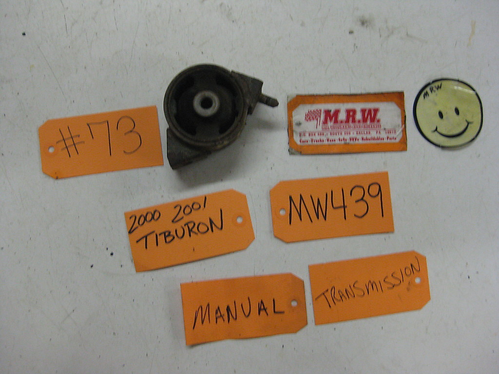 **YOU ARE LOOKING AT ONE USED MANUAL TRANSMISSION MOUNT** **IT FITS A 00-01 TIBURON WITH A 2.0L 4 CYLINDER ENGINE & WITH MANUAL TRANSMISSION.** **IT IS USED BUT IN GOOD CONDITION. IF YOU HAVE ANY QUESTIONS PLEASE ASK PRIOR TO BUYING. ALL SALES ARE FINAL. WE SELL EVERYTHING AS-IS, NO RETURNS. LOOK FOR MORE GREAT ITEMS IN OUR STORE. THANK YOU FOR YOUR BUSINESS! MRW488 MAY REPLACE PART #** 21930-29000 **STOCK# MW439 #73** **\*\*IT IS PULLED OFF & READY TO SHIP\*\***