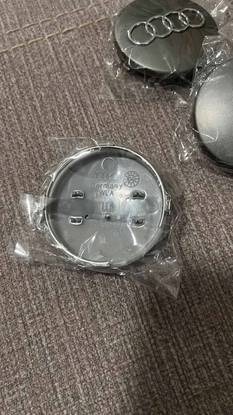 **just open to take picture, actually brand new** **AUDI Black Wheel Hub Center Caps SET (** **4 Pieces)** This Center Cap fits Most Current Audi Wheels and aftermarket wheel that requires 60mm (2.60 inches) center caps ·**Material: ABS Plastic** ·**Color : GRAY with Chrome Logo** ·**Dimension: 60 mm/ 2,36’’( Front ), 55 mm ( Back Clip )** ·**Quantity: 4pcs / set** ·**Fits to Most Audi CAR from 1998 - 2012 with dimension wheel center 60 MM** ·**A3, A3 QUATTRO, A4, A4 QUATTRO, A6, A6 QUATTRO, A8, A8 QUATTRO, TT, Q7, S4, S6, S8, RS4, RS6.**
