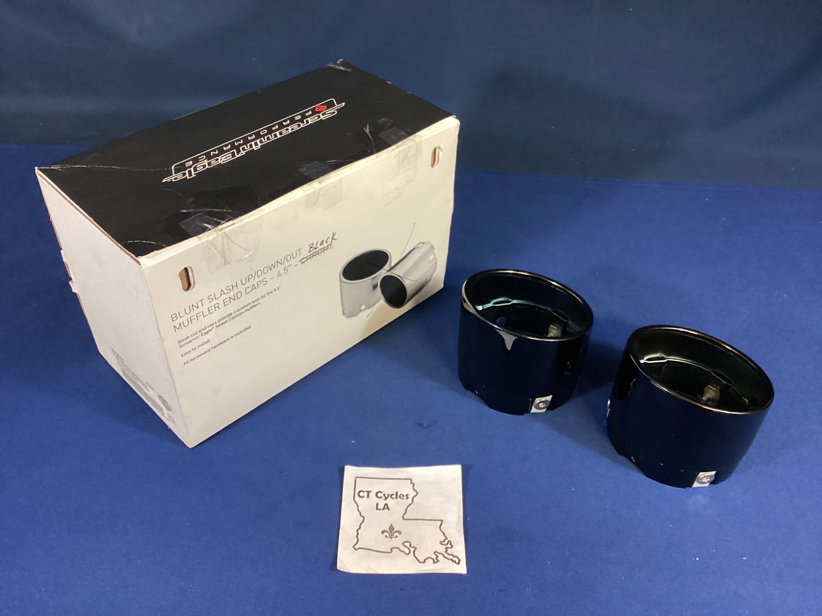 **NEW open box Harley Davidson Muffler 4.5” Blunt Slash/Up/Down End Caps, BLK. Taken off of a Display Model. Has some scratches. Please look at pictures.** **P/N: 65100208** **Fits: 17 - Later Touring models equipped with 4.5” Mufflers and Screamin’ Eagle Hight - Flow Systems with 4.5” Street Cannon Mufflers.** NEW IN ORIGINAL PACKAGING, UNUSED, **Since we are not a franchise dealer, we sell all of our parts as used, even if they are new in the box. Please ask questions, we are happy to answer them.** CHECK YOUR DEALER FOR MORE FITMENT INFORMATION. We are a family that loves to ride and we ride just about everything. We come across deals on inventory of all sorts and we pass those savings on to you. We strive very hard to make every customer happy, provide accurate descriptions with plenty of pictures and will do our best to resolve an issue if one should arise. We are NOT a Harley, Honda, Yamaha or any other franchise dealer. It is very expensive to list and ship items. We kindly ask that you follow these suggestions before buying from us. If you are not sure if it will fit your ride, DO NOT BUY IT! If you are not sure if you will like the color, DO NOT BUY IT! If you have not looked at the pictures or completely read the description, DO NOT BUY IT! If you are not sure that it is what you need, DO NOT BUY IT. If you know what you want/need, have done your due diligence, asked the proper questions, and are looking for a great deal on this, BUY IT! Ask questions prior to purchasing as all sales are final. We will assist in any way that we can and answer any questions that you may have. WE DO NOT ACCEPT RETURNS UNLESS WE HAVE MADE A MISTAKE ON OUR END. We sell new/used/OBS/ items. We describe them as accurately as possible. If you have a problem with any item, shipping damage, does not work as it should or something else, CONTACT US! All orders are shipped ground economy. If you would like your order expedited, please contact us prior to purchasing so we can add additional shipping fees. We ship within 48 hours, on BUSINESS days, often same day if possible. Thank you for looking and God bless. OB G1 Top. New Inventory