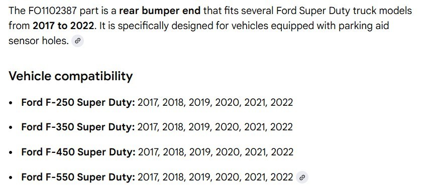 # \*\*\*BRAND NEW!!!\*\*\* 2017-2022 FOR FORD F250/350/450/550 RH REAR CHROME BUMPER END CAP .jpg&maxx=500&maxy=0) **Part Number:** 6557 ### Description 190-02231A Chrome Steel Rear Left Bumper End Cap Compatible for 2017-2022 Ford F250 F350 F450 F550 Rear RH Passenger Bumper Ends Caps Cover HC3Z17906KA FO1102387 - REPLACES FO1102387 WITH Parking Aid Sensor Hole (PLEASE CHECK FITMENT)!!! PLEASE SEE LISTING PHOTOS FOR VEHICLE FITMENT COMPATIBILITY & TECHNICAL SPECIFICATIONS!!! ABOUT US handpickedpartz SINCE 2003 NEW & Used parts supplier ARIZONA ARID DESERT PARTS - check our inventory for GENUINE OEM in stock. All used parts WILL SHOW WEAR, TYPICAL SCRATCHES etc. NOTABLE BLEMISHES photographed. Use MAGNIFY feature to VIEW DETAIL. Please review pictures carefully. READ the DESCRIPTION!!! Please CHECK FOR FITMENT prior to purchase! All items are carefully packaged and shipped as noted (24 0 48 hours). New parts may be repackaged to reduce shipping costs or better protect the product for the convenience of our buyers. SATISFACTION GUARANTEED!!! Please message with requests or visit our contact page to connect by phone. ### Additional Images - .jpg&maxx=500&maxy=0) - .jpg&maxx=500&maxy=0) - .jpg&maxx=500&maxy=0) - .jpg&maxx=500&maxy=0) Since 2003 - Your Trusted Source For Used OEM Auto Parts and Used Car Parts