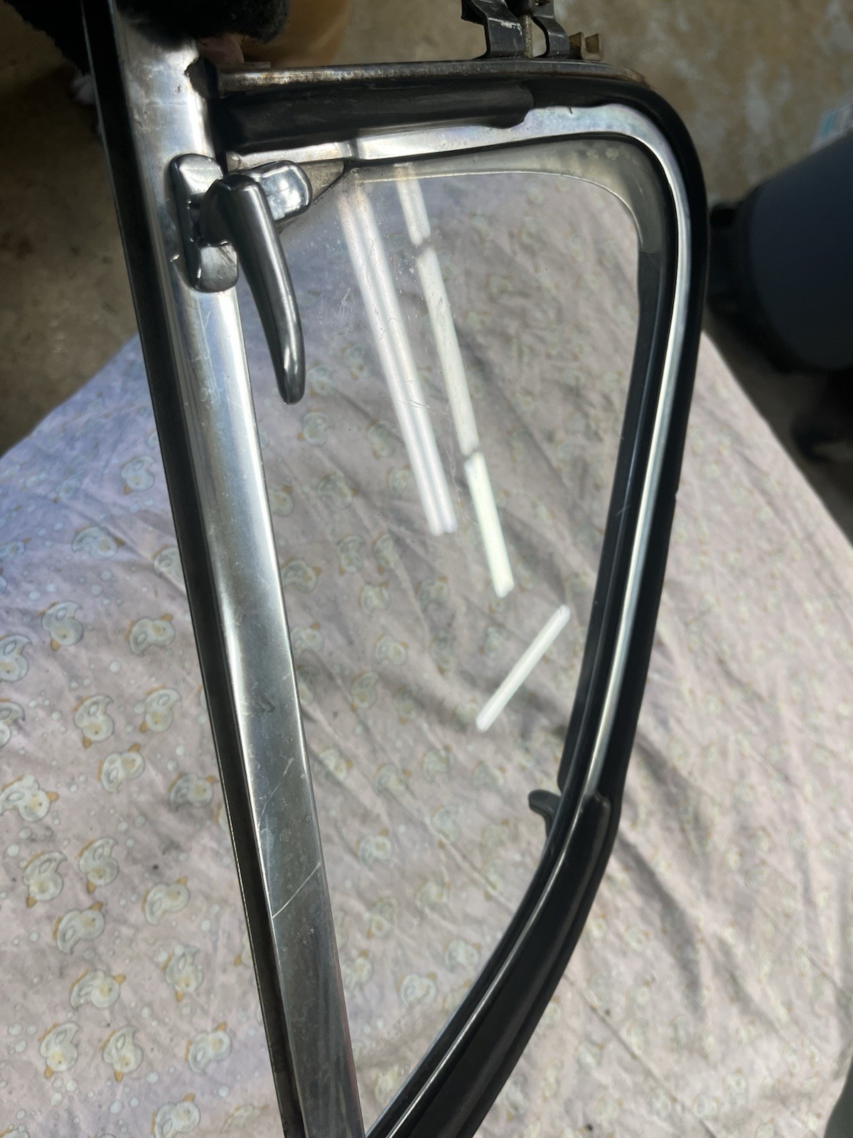 Check out this beautiful 1967 passenger side vent wing assembly that I am going to rate at a solid nine (9). Even the rubber seal is relatively soft and very usable. This is from a door that was never taken apart untill I did. Was stored off a car since 1974 when the car was parted out