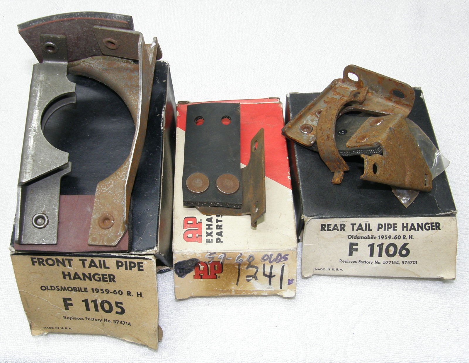 NORS 1959-60 Oldsmobile RH (Passenger Side) Exhaust System Hangers (Set of Three).These fit either single or dual exhaust system cars. Included are the following: Muffler Hanger (“B” In Illustration, But For RH Side); Resonator Or Front Secton Of Tail Pipe Hanger (All Except 1959 Models With Air Suspension) (“D” In Illustration, But For RH Side); Rear Tail Pipe Hanger (All Except 1960 Station Wagon Models) (“E” In Illustration, But For RH Side). * * * If you want to buy more than one item from me at the same time to receive a combined shipping charge, please add the items to your shopping cart by clicking the “Add To Cart” button under the “Buy It Now” button.After you are done shopping, view your “Shopping Cart”.Near the top center of the “Shopping Cart” page, you will see a “Request Total” line.Click on that to commit to buy and request a total.In most cases I should be able to ship all items in one box, and I will provide you the best shipping options.If you want to know beforehand what the combined shipping charged would be for some items you would be interested in, please contact me. * * *