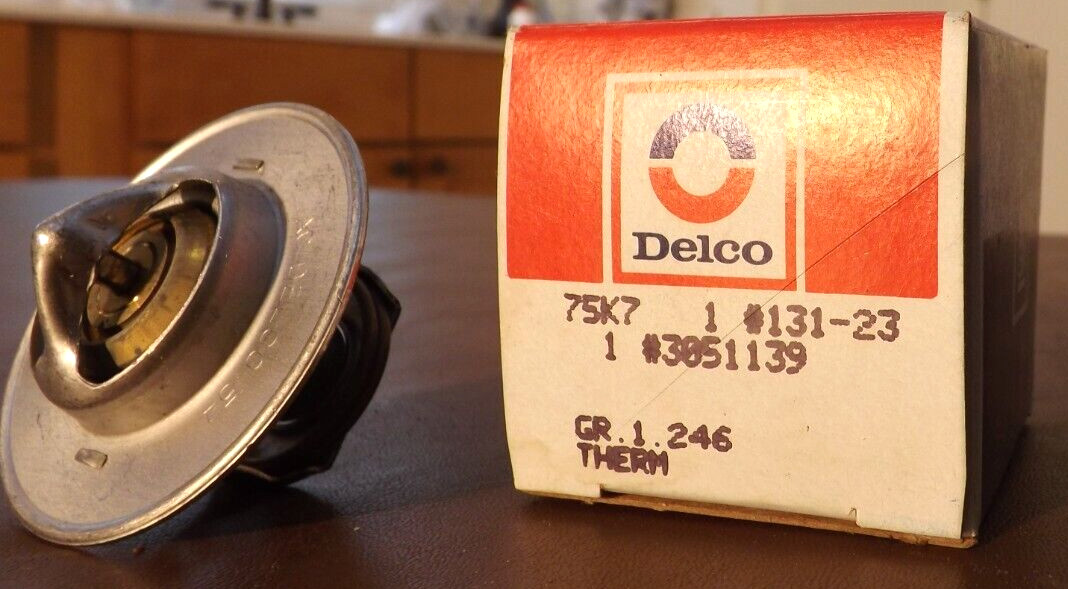 New In original box. DELCO #131-23 THERMOSTAT. NOS - Old fella worked at a Chevy Dealer since the late 1950s. It changed hands 3x and he kept his job every time. He worked into his 80s. He took everything home they were getting rid of and had a garage full of old car stuff. Thanks!aaaAa