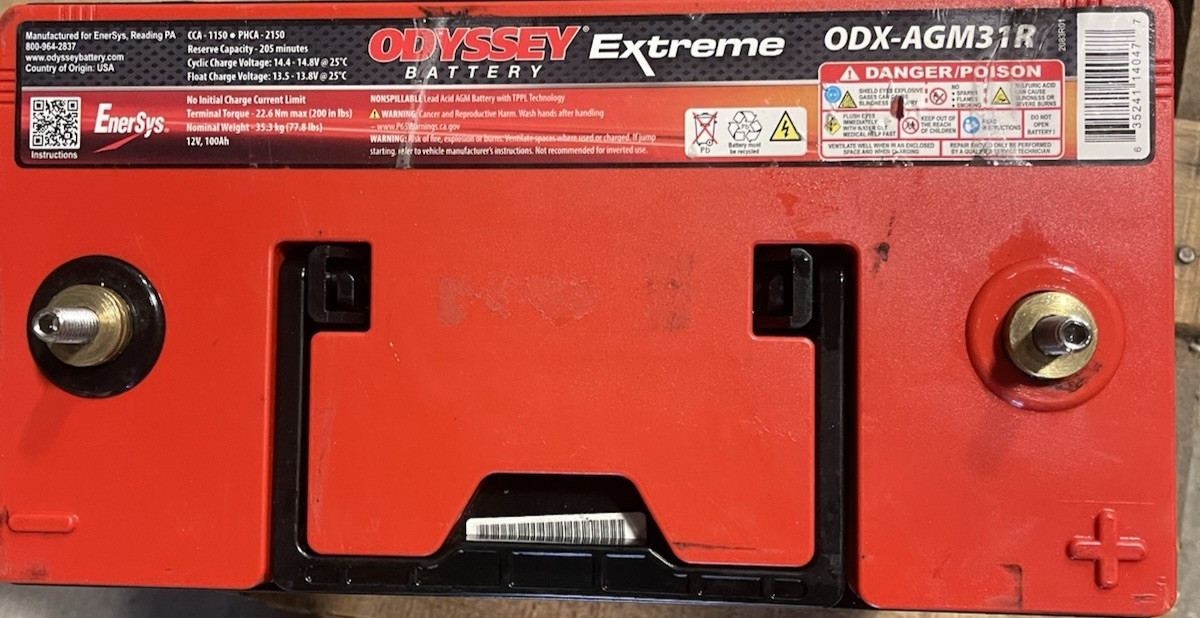 For sale is a **Genuine Odyssey Extreme Series AGM Battery**, model **ODX-AGM31R X**. This heavy-duty 12-volt battery is designed for exceptional starting power, deep-cycle performance, and long service life. Engineered with **pure lead AGM technology**, the Odyssey Extreme provides superior cranking amps, rapid recovery, and extreme durability for demanding applications. **Key Features:** - **Model:** ODX-AGM31R X - **Voltage:** 12V - **Battery Type:** AGM (Absorbed Glass Mat) - **Group Size:** 31R - **CCA (Cold Cranking Amps):** 1150A (approx., model-specific) - **Reserve Capacity:** 205 minutes (approx.) - **Pure Lead Plates for maximum performance** - **Vibration-resistant design** - **Deep Cycle + Starting Power in one battery** - **Longer service life vs. conventional batteries** - **Maintenance-free, spill-proof AGM design** **Applications:** Ideal for: - Commercial trucks - Heavy equipment - Marine applications - RVs and campers - Off-road vehicles - Performance automotive - Backup power systems \*\*\*NW\*\*\*