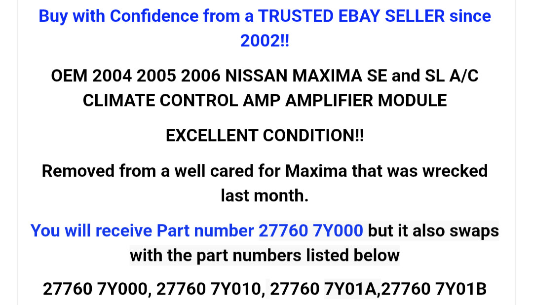 <font style="" rwr="1"><font style="" rwr="1"><font style="" rwr="1"><font style="" rwr="1"><font style="" rwr="1"><font style="" rwr="1"><font style="" rwr="1"><font style="" rwr="1"><font style="" rwr="1"><font style="" rwr="1"><font style="" rwr="1"><font style="" rwr="1"><font style="" rwr="1"><font style="" rwr="1"><font style="" rwr="1"><font style="" rwr="1"><font style="" rwr="1"><font style="" rwr="1"><font style="" rwr="1"><font style="" rwr="1"><font style="" rwr="1"><font style="" rwr="1"><font style="" rwr="1"><font style="" rwr="1"><font rwr="1" style=""><font rwr="1" style=""><font rwr="1" style=""><font rwr="1" style=""><font rwr="1" style=""><font rwr="1" style=""><font rwr="1" style=""><font rwr="1" style=""><font rwr="1" style=""><font rwr="1" style=""><font rwr="1" style=""><font rwr="1" style=""><font rwr="1" style=""><p align="center" style="font-family: Arial; font-size: large;"> </p><p style="font-family: Arial; font-size: 14pt; text-align: center;"><font color="#002cfd" face="Arial" size="6"><b>Buy with Confidence from a TRUSTED EBAY SELLER since 2002!!</b></font></p><p style="font-family: Arial; font-size: 14pt; text-align: center;"><font face="Arial" size="6"><strong>OEM 2004 2005 2006 NISSAN MAXIMA SE and SL A/C CLIMATE CONTROL AMP AMPLIFIER MODULE</strong></font></p><p style="font-family: Arial; font-size: 14pt; text-align: center;"><font face="Arial" size="6"><strong>EXCELLENT CONDITION!!</strong></font></p><p style="font-family: Arial; font-size: 14pt; text-align: center;"><font face="Arial" size="6"><strong>Removed from a well cared for Maxima that was wrecked last month.</strong></font></p><p style="text-align: center;"><font size="6" style=""><font color="#0039f3" style="font-family: Arial; font-weight: bold;"><font face="Arial" style="font-family: Arial;">You will receive Part number</font><font face="Arial" style=""> </font></font><span style="background-color: rgb(248, 248, 248);"><font color="#0039f3" face="Arial"><b>27760 7Y000</b></font><font face="Helvetica neue, Helvetica, Verdana, sans-serif" style="font-family: Arial;"><b> but it also swaps with the part numbers listed below</b></font></span></font></p><p style="font-family: Arial; text-align: center;"><span style="font-size: xx-large;"><font face="Arial" style="font-weight: bold;">27760 7Y000, 27760 7Y010,</font><span style="font-weight: bold; background-color: rgb(248, 248, 248); color: rgb(51, 51, 51); font-family: "Helvetica neue", Helvetica, Verdana, sans-serif;"> </span></span><strong style="font-size: xx-large;"><font face="Arial" style="">27760 </font><span style="background-color: rgb(248, 248, 248); font-family: "Helvetica neue", Helvetica, Verdana, sans-serif;">7Y01A,</span></strong><strong style="font-family: "Helvetica neue", Helvetica, Verdana, sans-serif; font-size: xx-large;">27760 7Y01B</strong></p></font></font></font></font></font></font></font></font></font></font></font></font></font></font></font></font></font></font></font></font></font></font></font></font></font></font></font></font></font></font></font></font></font></font></font></font></font>