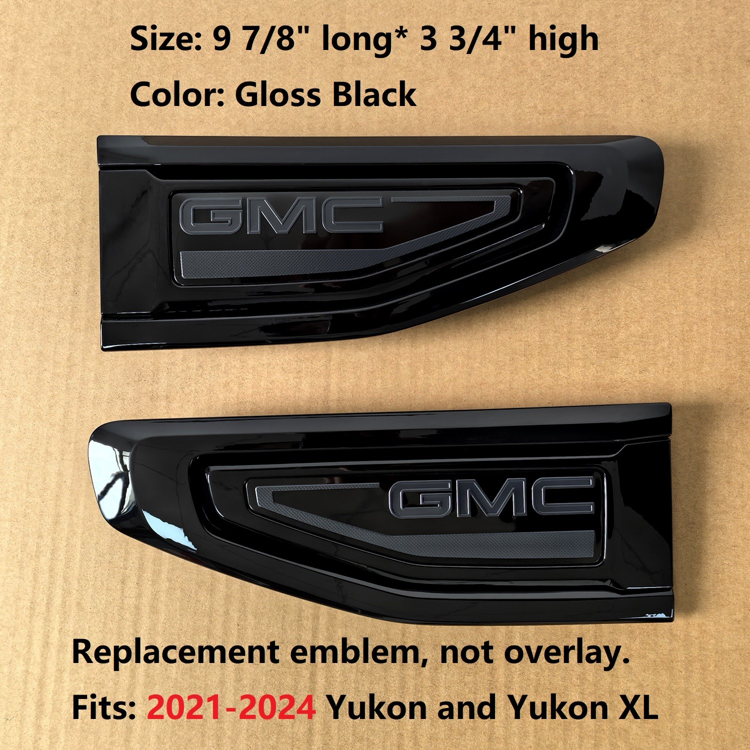 **High quality product** **fits:** - **2021-2024 Yukon and Yukon XL** **Prats number: 84846762 84846763** **Replaces: 84719437 84719438 84719439 84719440 84719441 84719442** Features: 1.100% brand 3D new and Very High Quality - OEM Automotive ABS. 2\. This is Real 3D emblem and NOT just a thin stickers, Not overlay emblem, It can replace the original emblems. 3.Installation: Remove your original chrome vent emblem,then stick this on, 6.Easy to install to your Fender Vent,if you have any problem,please ask us for helping. Color: As the first picture. Size: 9 7/8" long\* 3 3/4" high Package Include: Left and right vent emblem