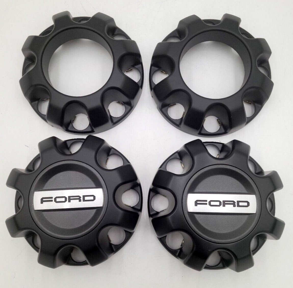 OEM Ford Super Duty Front Matte Black Open Center, Rear Matte Black with Matte Black Ford Text Center Cap - SET of 4 Center Caps (2-Front, 2-Rear) Kit Part #: LC3C-1A108-HEA Front Part #: (2) - LC3C-1A096-HAA Rear Part #: (2) - LC3C-1A096-GCA Like New - Take Off - Item May Have Minor Imperfections. Number of Lugs on Front: 8 Number of Lug Mounts on Back: 8 Inside Color: Grey Lug Type: Open Compatible with the following Model/Make/Year: - Ford F-250 Super Duty 2023 - 2024 - Ford F-350 Super Duty 2023 - 2024 - Ford F-450 Super Duty 2023 - 2024 - Ford F-550 Super Duty 2023 - 2024 - Ford F-600 Super Duty 2023 - 2024 **Please verify fitment prior to purchase as there are multiple variations for each year and model that look similar but have slight differences.** **Please make sure you are verifying your part number on the back of your center cap, the number of lugs on the front and back, as well as height of your center cap.** **If you are unsure, please send us your vehicle's VIN number and/or a photo of the front and back of your center cap and we can verify fitment prior to purchase.** **Buyer Pays Return Shipping If Item is Purchased By Mistake of Due to Buyer Error**