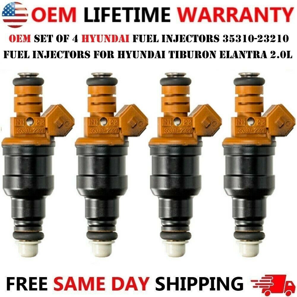 GENUINE HYUNDAI Set of 4 Re-manufactured 4 Hole Upgraded Flow Matched Fuel Injectors For **_1997-2001 Hyundai Elantra Hyundai Tiburon 2.0L I4_** \*\*\*These Injectors are NOT aftermarket\*\*\* \*\*\*FREE SAME DAY SHIPPING & LIFETIME WARRANTY\*\*\* Manufacturer Part Number # 35310-23210 Please use our compatibility chart or verify with your part number to see if these injectors are right for your car!!! Compatible Vehicles Fuel injectors for: **_\> 1997, 1998, 1999, 2000, 2001 Hyundai Tiburon 2.0L I4_** **_\> 1999, 2000 Hyundai Elantra 2.0L I4_** **Benefits of Upgraded Units** _4 Hole Upgrade_ _Improved Leak Resistance_ _Faster Response Time_ _More Precise Fuel Metering_ _Improved Atomization_ _Improved Coil Design_ Re-manufacturing procedure: - All of our injectors come with new High-Quality components such as o-rings, seals, filters, gaskets, caps, spacers etc. - Back-flushed to remove internal debris. - Internally and externally cleaned with various ultrasonic treatments using the latest equipment in the industry. - All parts are checked for major damages & cracks. - Leak, flow, pressure, OHM, spray tested using ASNU machines. - Calibrated for even flow (+/-2%) Highly Recommended: - Before installation, you must lubricate all seals and O-rings!!! - We highly recommend any auto part to be installed by a professional mechanic. - We are not responsible for any damages caused by improper installation. All re-manufactured injectors were previously used and may have light scratches, faded colors, and signs of usage. However, they will still function as if they were new. Shipping: Handling time - 1 business day International, Priority, and Express shipping is also available. Warranty: We provide a LIFETIME WARRANTY for all our products (For Warranty claim please contact us) Returns and refunds: We accept returns within 60 days after receiving the package. All returned items must be unused and in the original packaging.