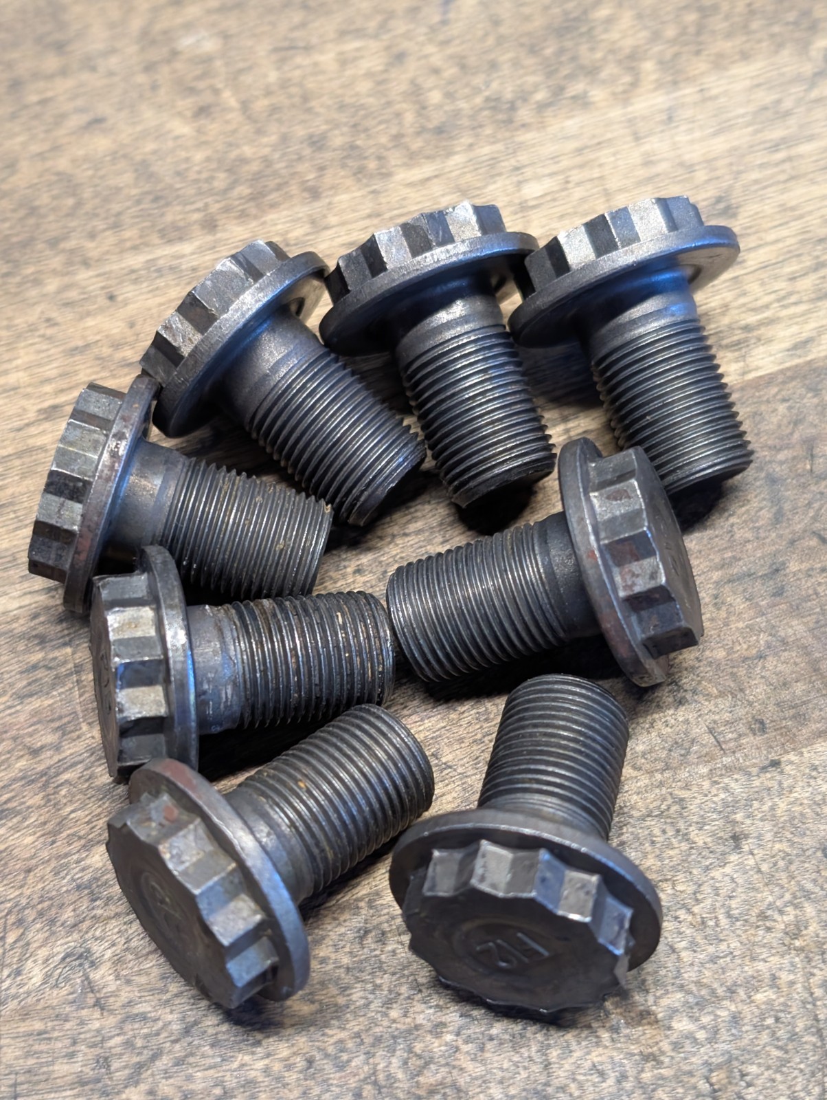 Used OEM manual transmission flywheel bolt set for various Honda and Acura vehicles. Set comes with 8 bolts. Check compatibility before purchase. Several sets available; shipped item will be similar to item seen in photos.