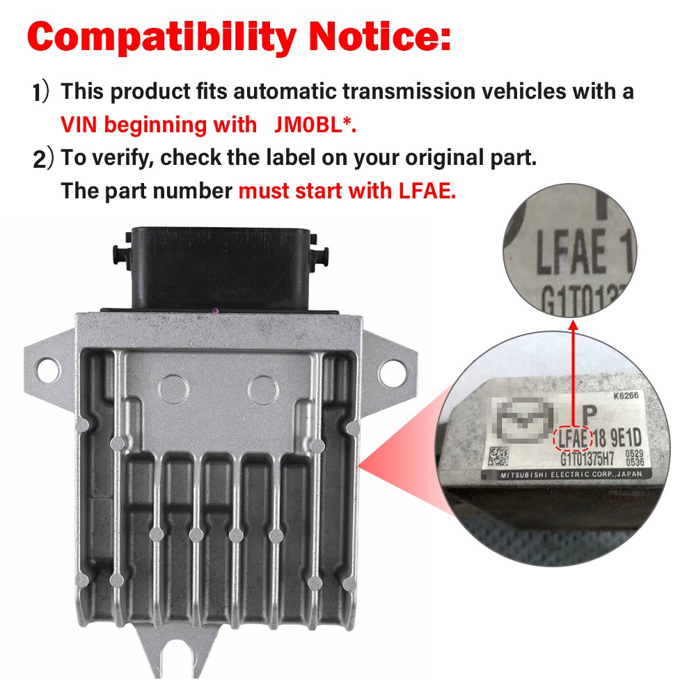 must start with LFAE._ _OE/OEM Part Nubmer:_ **L539189E1D/L539189E1E/L539189E1C/L539189E1D** **L539189E1E/L539189E1F/L539189E1G/L539189E1H** **L539189E1J/L539-18-9E1A/L539-18-9E1C** **L539-18-9E1D/L539-18-9E1E/L539-18-9E1F/L539-18-9E1G** **L539-18-9E1H/L539-18-9E1J** * * * _Fits:_ **Compatible with MA-Z-DA 3 2.5L 2010-2011** * * * _Package Included:_ **1 piece** Important NoteDelivery detailsTerms of salesPaymentContact us Important Note **Note: Any Free Shipping Promotion is Valid to the 48 contiguous states. for Alaska, Hawaii, Puerto Rico, Guam,Virgin Islands and Samoa, extra shipping fee will be charged.** 1.Please be very careful to check our photos and OEM No. Before you purchase, make sure the photo showed is same as you wanted.thanks 2.Please offer us your correct address includes receiver,city,state,zip code,country in English language,and also mark down the phone number which could contact with you.thanks 3\. If you want to buy more items or you are a wholesaler , just tell us and we will give you a comfortable price, Thanks!!! Delivery details Handling time: 1 business day (Orders are not processed on weekends & holidays) Tracking information will be sent once item is shipped. Local pick-up is unavailable at the moment. Leaving correct address can minimize delay. Depending on the seller's address, items may be shipped from the eastern or western. Terms of sales Return is acceptible within 60 days of delivery. Return for replacement or money back is optional. Returned items must be in brand new, unaltered and resalable condition. Buyers pay return and replacement shipping cost. Seller is not responsible for any customs duty/import tax, labor cost, expense in a dealer store, or damage due to wrong installation. Payment Please make sure your shipping address is correct and up-to-date. Payment from bank account and all major credit cards will be accepted. Contact us PaymentDelivery detailsTerms of salesAbout usContact us All messages will be answered within 1 business day. BrandGOConnector TypeFemaleInterchange Part NumberL539 18 9E1D, L539 18 9E1F, L539 18 9E1G, L539 18 9E1HInterchange Part Number 1L539189E1J, L539189E1F, L539189E1D, L539189E1AManufacturer Part Number0221151382Manufacturer Warranty3 YearsMaterialAluminumOE/OEM Part NumberL539-18-9E1EPlacement on VehicleFrontSuperseded Part NumberL539 18 9E1ETypeTransmission Control ModuleTIPSPart NO . must start with LFAE.