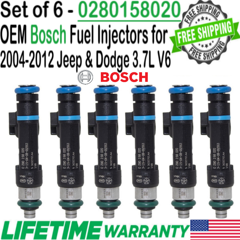 OEM AND GENUINE PARTS ONLY FREE SAME DAY SHIPPING AND LIFETIME WARRANTY Original Equipment Manufacturer’s part number: 0280158020 OEM Remanufactured Bosch Set of 6 (6 pieces per order) 4-Hole Upgrade Fuel Injectors for the Vehicles listed below… **Benefits of the Upgraded Units** **4-Hole Upgrade** **Improved Leak Resistance** **Faster Response Time** **More Precise Fuel Metering** **Improved Atomization** **Improved Coil Design** To see if these injectors are right for your car, kindly check our compatibility chart or check with your part number!!! Compatible Vehicles: - Fuel Injectors for2004, 2005, 2006, 2007, 2008, 2009, 2010, 2011, 2012 Dodge RAM 1500 3.7L V6 How the work is done! 1. All of our injectors come with new High-Quality components such as O-rings, seals, filters, gaskets, caps, spacers etc. 2. Back-flushed to remove internal debris. 3. Internally and externally cleaned with various ultrasonic treatments using the latest equipment in the industry. 4. All parts are checked for major damages & cracks. 5. Leak, flow, pressure, OHM, spray tested using ASNU machines. 6\. Calibrated for even flow (+/-2%) Strongly Advised: All seals and O-rings must be lubricated before installation!!! We strongly advise that any vehicle element be installed by a qualified mechanic. We are not liable for any damages incurred as a result of faulty installation. All remanufactured injectors have been used before and may have minor scratches, faded colors, as well as other signs of usage. Although, they will continue to function as if they were Brand New. Shipping: Handling time - 1 business day International, Priority, and Express shipping is also available. Warranty: We provide a LIFETIMEwarranty for all our products (For Warranty claim please contact us) Returns and refunds: We accept returns within30 days after receiving the package. All returned items must be unused and in the original packaging.