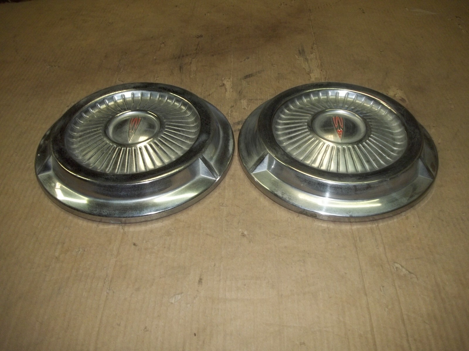 A pair of TWO (2) Oldsmobile factory center hubcaps.Measuring about 10 1/2" across the back.Magnet does not stick to these hubcaps.Match pictures and style for correct replacement.This is a VERY used pair of two hubcaps with MANY deep scratches / scrapes and large dings / dents.These scratches / scrapes and dings / dents will be noticeable from even a short distance.Entire faces dinged and dented.The original finish is VERY faded and worn due to time.Oxidation and corrosion.Staining that does not polish off.Paint worn away.Chrome thin and peeling off.Slightly bent out of round when laid flat but attach to wheels as designed.Mounting lips bent out of line and uneven but attach secure.Poor driver car quality.On a scale from 1 to 10, this pair of two hubcaps rate a "5" or less in condition.Buyer to pay shipping with a flat rate of $16 within the continental U.S..Elsewhere there are additional charges.Accept most methods of payment.California buyer to pay state sales tax.