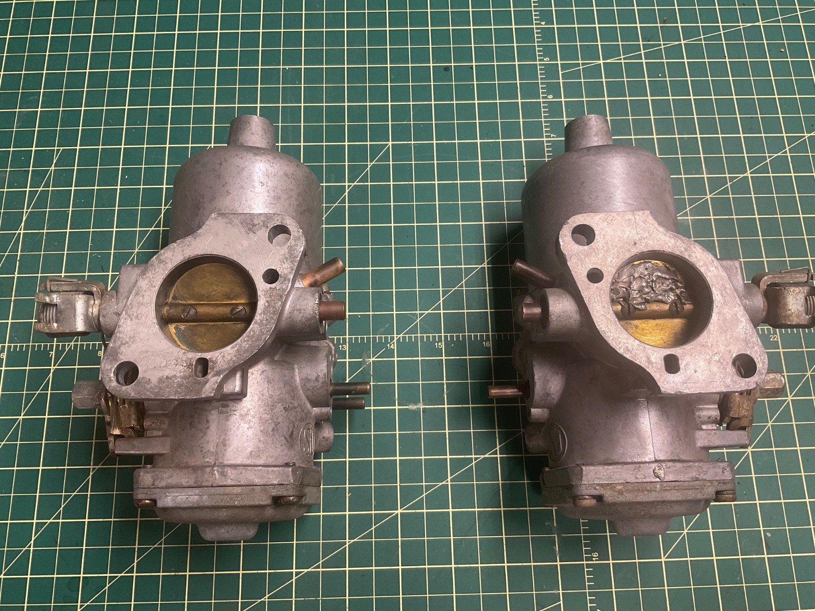 I received these carburetors with a bunch of MGA parts I purchased. They are from an MGB and could be of use to someone for parts or rebuild. They are clean and mostly complete with the exception of the linkage and the damper caps. It appears that something was attempted on the rear carb as there is solder on the throttle disc?? All parts are available to rebuild these carbs. Please feel free to ask questions.
