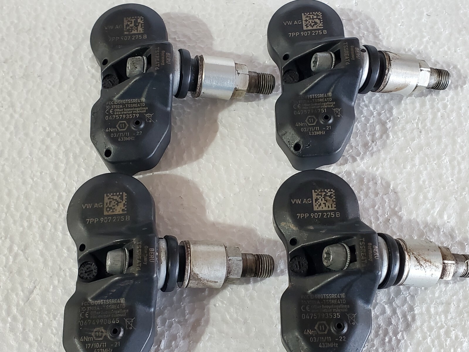 **Original factory set of 4 used TPMS air pressure sensors.** **Fits many models and years. Please check part #s.** **These were taken off 20" wheels from a Porsche 911** **These are used sensors that fit many applications, there for I can guarantee 100% they will work with your exact application.** **I do offer 100% money back gaurantee if any problems.** **Included: exactly what is pictured 4 sensors** **Shipping is FREE in the continental U.S. via priority mail. Fed ex quicker service is available.** **Please ask any questions if needed.** **Thanks and good luck!**