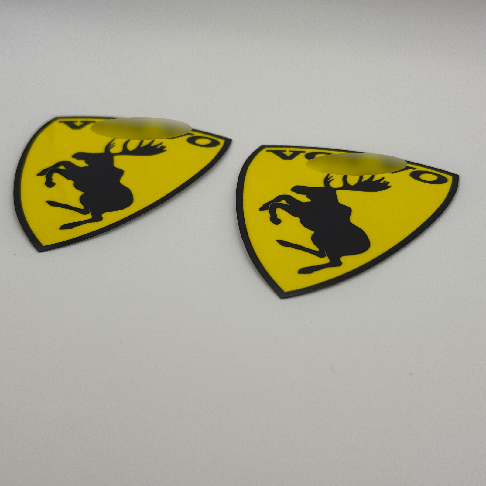 Brought to you exclusively by Auslander Volvo, this is a pair of two (2) genuine Prancing Moose traditional 'Black on Yellow' decals. _We offer MANY color combinations and sizes, so if you don't see what you're looking for you can always contact us!_ **SHIPPING** Shipping includes tracking whether you are located in the US or internationally. We DO offer combined shipping discounts and we DO ship worldwide. The History of the Prancing Moose, By Dave Barton When the XC90 debuted in 2003, Volvo was busy organizing a number of test drive events, where quite a few Volvo fans came out to see and test-drive the new SUVs on some fast cone slalom courses. Volvo was showing off their new, advanced Dynamic Stability Traction Control (DSTC), a first of its kind for an SUV. Attendees were allowed to drive the slalom courses by themselves as many times as they wanted. One of the courses was a special slalom, where a professional driver would take a full carload of folks in the new SUV, accelerate quickly to about 60 mph, and while keeping his foot firmly planted on the gas... to the floor, he would then crank the wheel as fast as he could one direction, then the other through a tight set of cones. This maneuver simulated a very sudden high-speed avoidance of an obstacle in the road, such as a MOOSE (of course). Volvo was calling this course the"MOOSE AVOIDANCE TEST." This stuck in my mind as a remarkable event and something no other SUV at that time would dare try without a full roll cage and everyone in helmets. Then in January 2005, when Volvo began showing their special concept XC90 at car expos, I spotted one of them at the Los Angeles International Car Expo. It was sporting a shield sticker with a STANDING MOOSE profile on its fender. I think Volvo chose to put that moose on their car because of their Moose Avoidance Test. That sticker got a lot of smiles from the crowd. I instantly thought it could be better as a Prancing Moose; a parody of the Ferrari prancing horse.  I had a car show coming up in a few weeks, so I made some stickers and put them on my 240 below for that show. The new PRANCING MOOSE stickers went on the fenders and tailgate of my 245 below for the January 2005 SoCalEuro Meet in Anaheim, California. The response to those stickers from attendees was a big surprise. Photos were turning up in web pages and magazines all over. People eventually tracked me down and I began receiving many requests for that sticker (and then later other styles). So I began making a few at a time. I never really expected it would become popular or something others would want... and the rest is history!  The Prancing Moose designs and images are copyrighted and owned by Dave Barton. These images may not be used without expressed written permission. This copyright is registered with the US Copyright Office under registration number VA0001423751, Dated 5/23/2007.