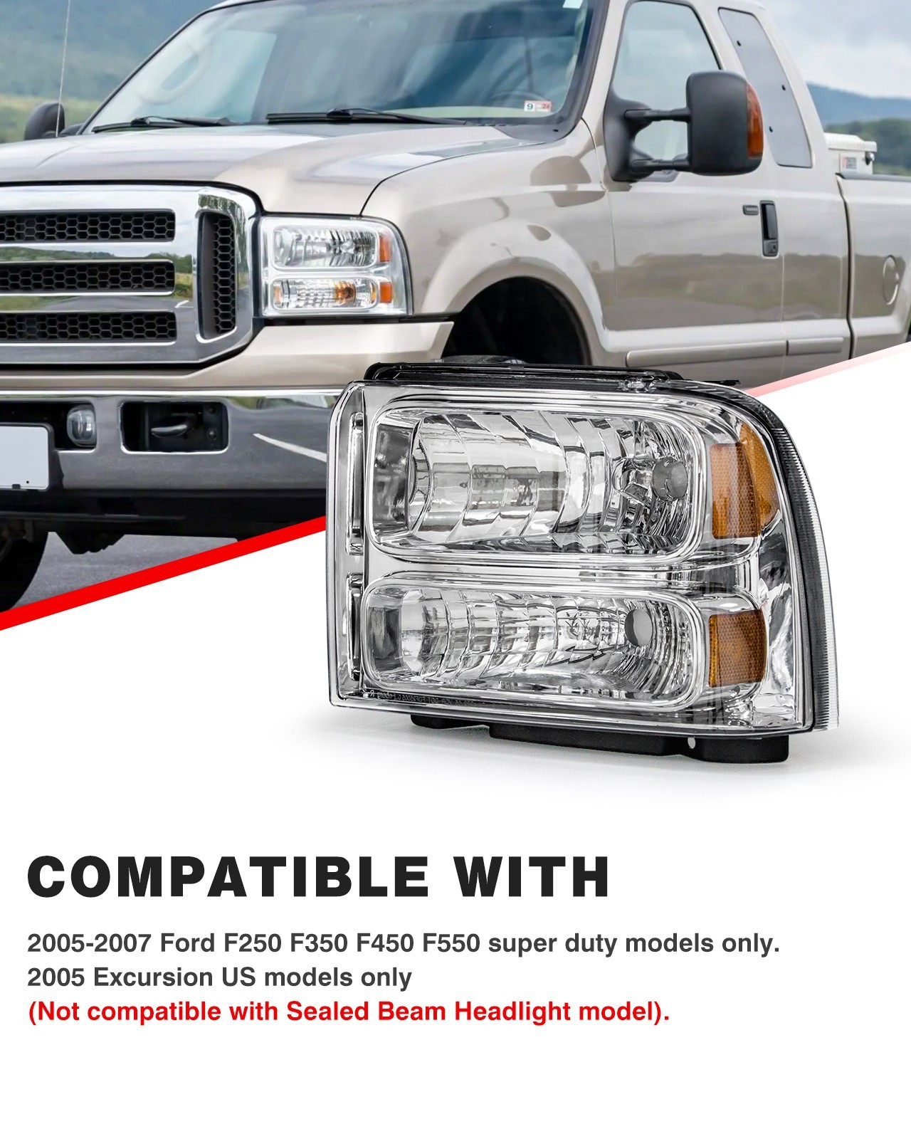 **Compatible with:** - For 2005-2007 Ford F250 F350 F450 F550 Super Duty Models only - For 2005 Excursion US models only - Not compatible with Sealed Beam Headlight model **Kindly note:** Bulbs are not included. please use stock bulbs for installation(H13,3157). **Package Includes:** - 1 x Pair Headlights(Left & Right) - 1 x User manual **REPLACEMENT HEADLIGHTS** Our replacement headlights are built to meet the highest standards of quality, ensuring a precise fit and reliable performance, all while offering exceptional value. These headlights come fully equipped with plug-and-play wiring, making installation straightforward so you can quickly return to the road with confidence, knowing your vehicle’s visibility will be safe in any conditions. **Why Choose Our Headlights:** - Easy Installation and Perfect Fit - Crafted to seamlessly replace your original headlights, meeting both DOT and SAE regulations. - Designed for simple installation with plug-and-play connections, eliminating the need for complicated wiring. **Enhanced Nighttime Visibility** - Cutting-edge engineering guarantees superior illumination for safe driving in low-light or inclement weather. - UV-protected lens prevents yellowing and degradation, keeping your headlights clear and bright. **Quality You Can Trust** - Manufactured in top-tier, ISO and IATF16949 certified facilities for assured quality. - Rigorous testing ensures that every headlight meets strict performance, durability, and fitment standards. - Real-world testing ensures that our headlights perform under all conditions, including intense cycling and road tests.