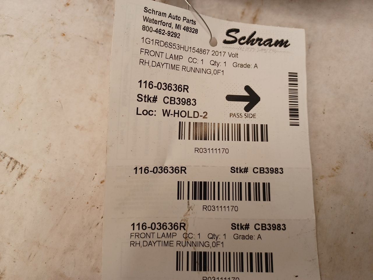 1923   Description RH,DAYTIME RUNNING,0F1 Mileage: 47000 This item will fit the following vehicles/applications: VOLT 16-19 daytime running lamps, R. **Illuminate the Way with Reliable Fog Light and/or Running Light!** **Schram Auto and Truck Parts - Fog Lights and Running Lights** At Schram Auto and Truck Parts, Inc., we recognize the significance of clear visibility in various driving conditions. Our **Fog Light / Running Light** not only enhances your safety, but it also adds a touch of style to your vehicle. We take pride in offering tested and inspected fog lamps, all in perfect working condition. As a trusted automotive recycling company since 1923, we provide quality original equipment fog lights that continue to serve an essential role in helping others repair, restore, and enhance their vehicles. Rest assured that all of our fog lamps have undergone testing and inspection to ensure their flawless performance. Please note that the fog lamps are sold without grilles or bezels, unless stated otherwise. Wear and scratches from normal use are expected on this item. To ensure the perfect fit, refer to the 'Fitment' section of this listing for precise compatibility. We strongly recommend confirming compatibility before making a purchase to ensure a seamless fit. **Your Questions Are Important** If you have any questions or need further information, please ask us before making a purchase! We're here to provide the details you need to make an informed decision. Illuminate the road ahead with reliable Fog and Running Lights from Schram Auto and Truck Parts, Inc. Join us in our commitment to providing top-notch solutions while enhancing your vehicle's safety and style. Vehicle 2017 Volt Mileage 47000 Part Grade A What's this?