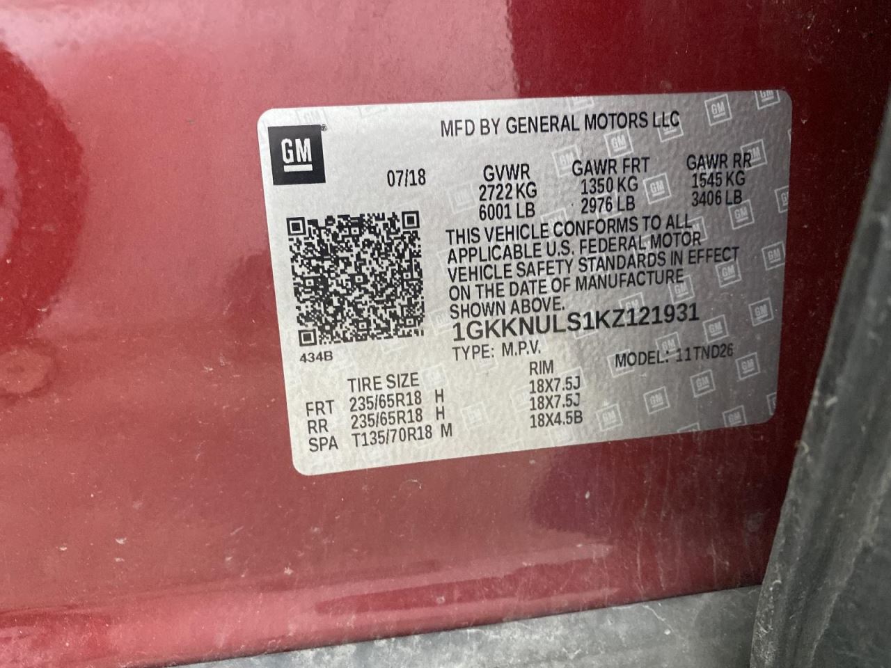 - VIN #: 1GKKNULS1KZ121931
