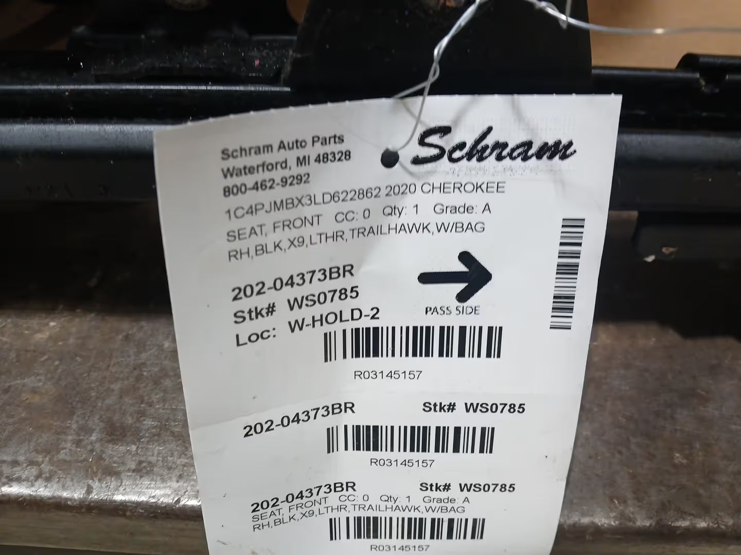 1923   Description RH,BLK,X9,LTHR,TRAILHAWK,W/BAG Mileage: 56000 This item will fit the following vehicles/applications: CHEROKEE 15-20 (air bags), (bucket), manual, leather, w/o fold flat; w/o in seat storage; R. CHEROKEE 21-22 manual, leather, w/o fold flat; w/o in seat storage; R. **Upgrade Your Vehicle's Interior with a Quality Used Seat!** **Schram Auto and Truck Parts - Seat** Revitalize the interior of your vehicle with a reliable and affordable **Seat**. This listing offers you the opportunity to upgrade your driving experience by replacing worn-out or damaged seats with quality used options that provide both comfort and style. **Signs of Wear from Normal Use** These seats may show signs of wear from normal use, but they still offer a great solution for enhancing your vehicle's interior. It's important to note that any non-direct interchange applications might require additional items or procedures, and it's the buyer's responsibility to ensure proper fitment. **Fitment Verification** Ensuring a proper fit is crucial when replacing seats. Please make use of the description, conditions and options, pictures, part numbers, and VIN provided to confirm that these seats are the correct part for your vehicle. Fitment is the responsibility of the buyer. **Important Airbag Information** **Attention:** Listings containing '-253' in the Conditions and Options **do not include airbags**. This crucial detail ensures your safety and should be considered carefully before making your selection. **Quality at a Fraction of the Price** All seats are sold 'as is' and may be missing small plastic or trim pieces. Despite this, our seats offer exceptional value compared to new dealer prices. You can enhance your vehicle's interior while staying within your budget. Our knowledgeable team is here to help you make an informed decision. Upgrade your driving experience with a quality used seat from Schram Auto and Truck Parts. Enjoy the comfort and style of a new seat without breaking the bank. Vehicle 2020 CHEROKEE Mileage 56000 Part Grade A What's this?