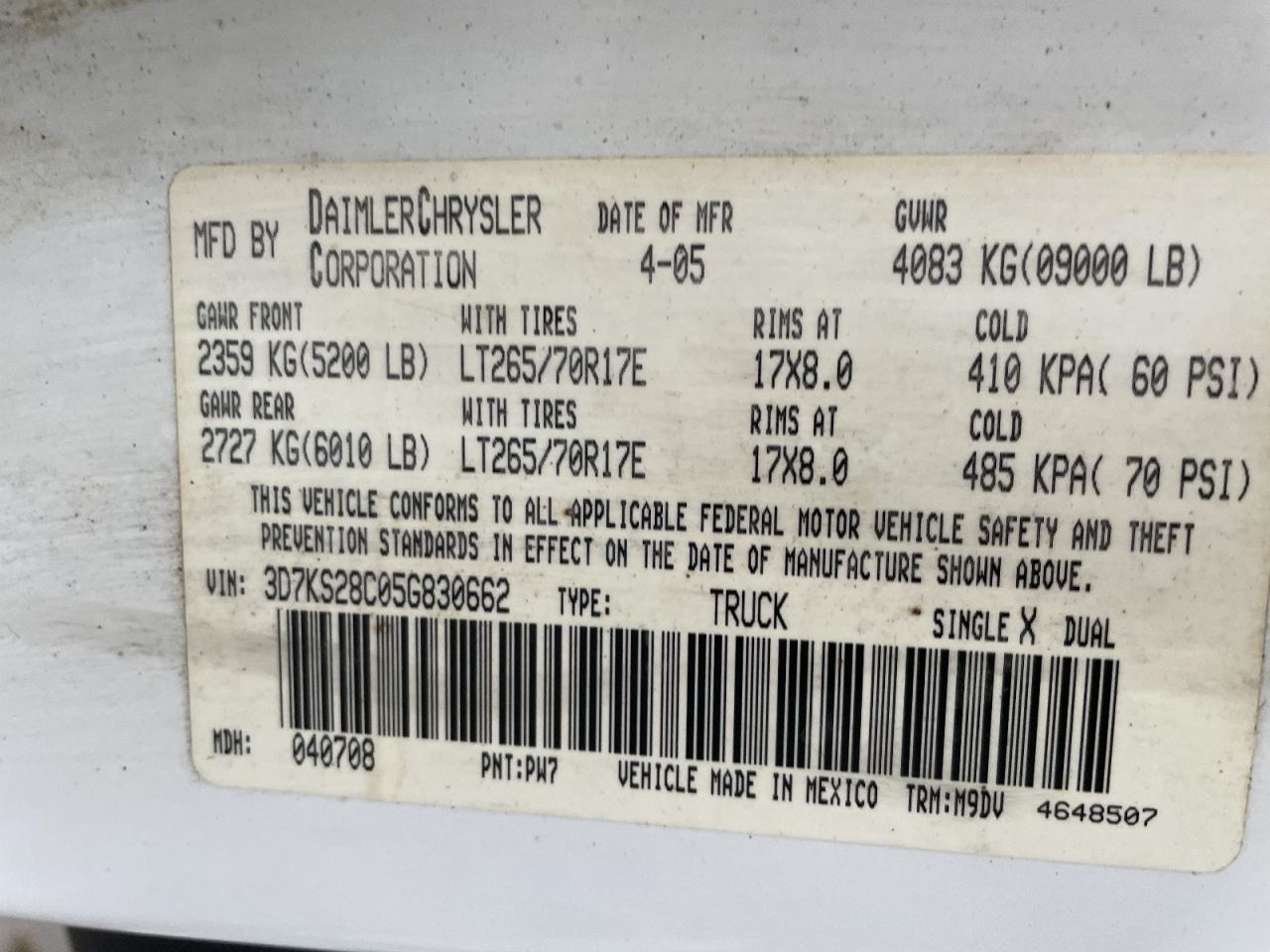 - VIN #: 3D7KS28C05G830662
