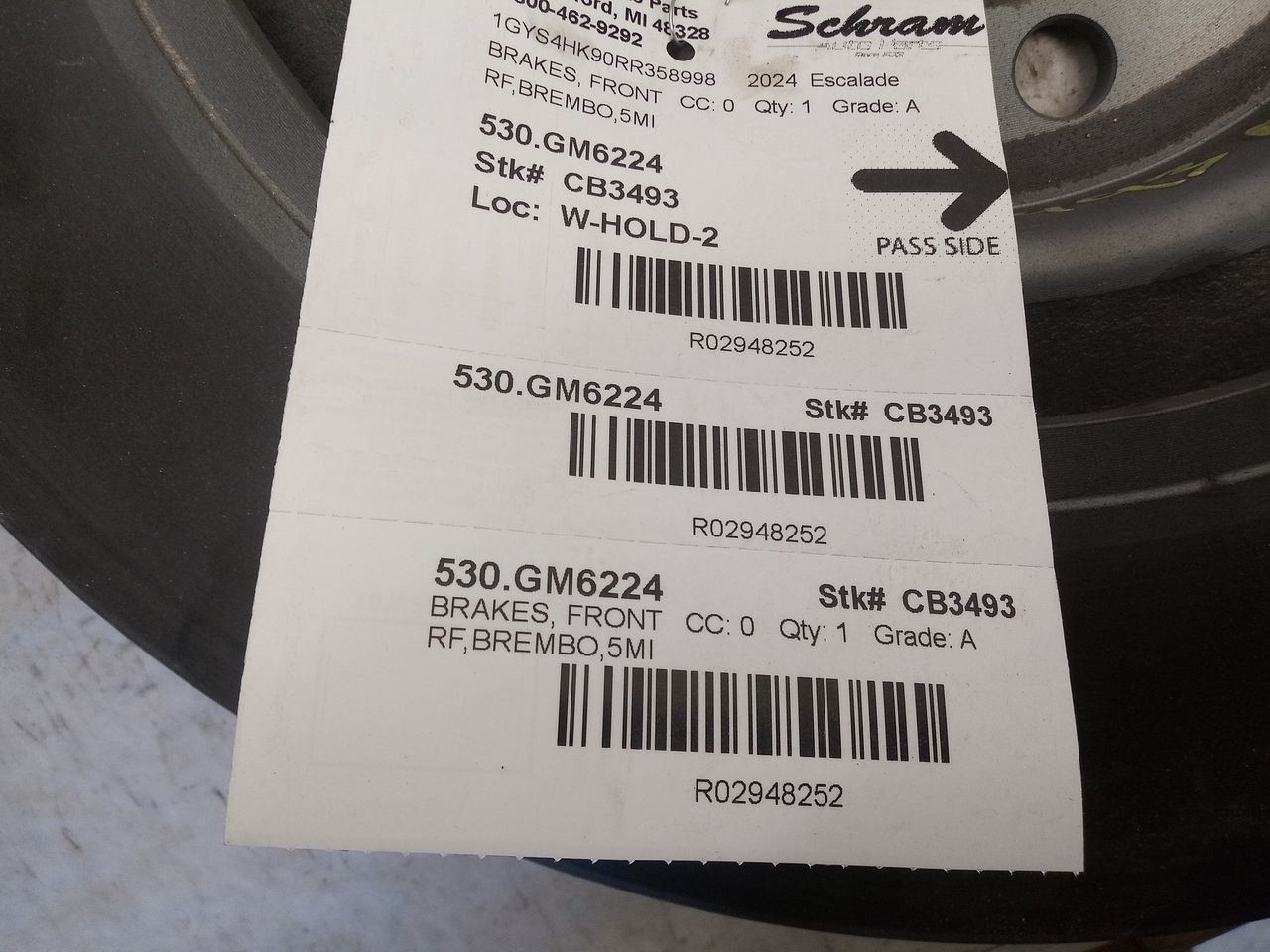 Description RF,BREMBO,5MI Mileage: 0 This item will fit the following vehicles/applications: ESCALADE 21-23 w/high performance brakes (opt 5JL) ESCALADE ESV 21-22 w/high performance brakes (opt 5JL) SILVERADO 1500 PICKUP 23-25 w/police package (heavy duty brakes) SUBURBAN 1500 21-24 w/high performance brakes (opt 5JL) TAHOE 21-24 w/high performance brakes (opt 5JL) YUKON 21-24 w/high performance brakes (opt 5JL) YUKON XL 1500 21-23 w/high performance brakes (opt 5JL) **Enhance Your Vehicle's Braking Performance with a Front Rotor or Drum** **Schram Auto Parts - Front Rotor or Brake Drum** **Confirm Fitment Before Purchase** This listing is for a vehicle-specific **Front Brake Rotor or Drum**. It was removed from a working vehicle and inspected to ensure quality. This part is not universal—please use the provided part number, vehicle compatibility chart, and detailed photos to confirm a match for your application. **Why Replace Your Rotor or Drum?** Rotors and drums wear down over time, reducing your vehicle's stopping power. Replacing with OEM parts helps maintain safe, effective braking and restores manufacturer performance standards. **Part Condition** Surface rust or cosmetic wear may be present from handling or storage, but the rotor or drum will be in usable condition unless otherwise noted in the Conditions and Options section. **Warranty and Support** Backed by our 90-day **parts-only warranty** for peace of mind. If you have any questions about compatibility or installation, please reach out. Ask for Chad—he’s happy to help! **Trust Schram Auto Parts** Since 1923, Schram Auto Parts has supplied high-quality used OEM components you can trust. Let us help get your vehicle back on the road with safe, reliable braking. Vehicle 2024 Escalade Mileage 0 Part Grade A What's this?