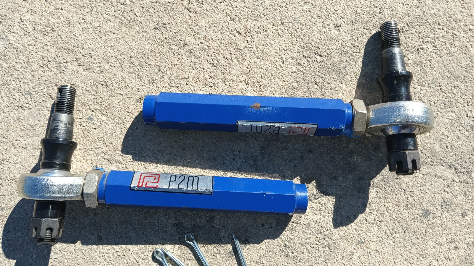 **P2M ProOuter Tie Rods for Mazda RX8** Used set ofp2m outer tie rod ends for mazda rx8. Includes everything pictured. Dust bootare included but could use replacement. Here is someinformation about these parts from the manufacturer: Part number:P2-POTRRX8-HT Description: Replace yourworn-out stock outer tie rods with our P2M unit for improved performance andreliability. Made from high quality strong SC45 steel tubing along with 3pcTeflon self lubricated rod ends and dust boot. Will withstand a lifetime ofabuse whether you are street driving or racing the car. Legal only for use in competition vehicles which may never be registered,licensed, and/or used on public streets or highways; and also for use in otherexempted vehicles.