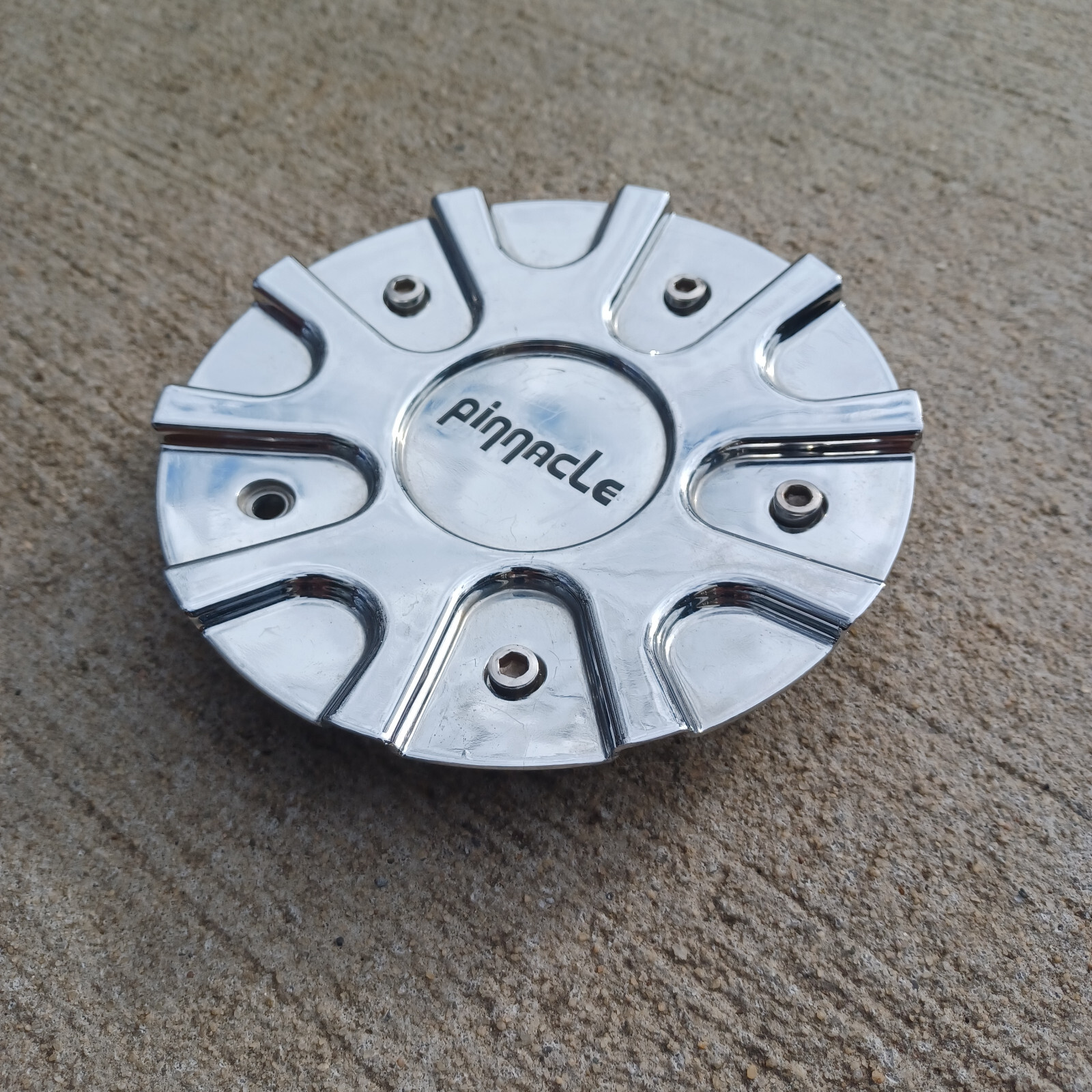 Pinnacle custom wheel center cap, chrome, part number P72-18-CAP, LG1210-19 01 Please pull one of your existing center caps to compare part numbers. Satisfaction guaranteed. Please see terms for details. This is a used (Recycled!!!) hubcap from a salvage yard. All mounting components are in excellent condition. May have some scratches. OEM Genuine Pinnacle part. All hubcaps are professionally cleaned, front and back. You won't need to wear gloves to install your hubcap, and your hands will not get dirty!