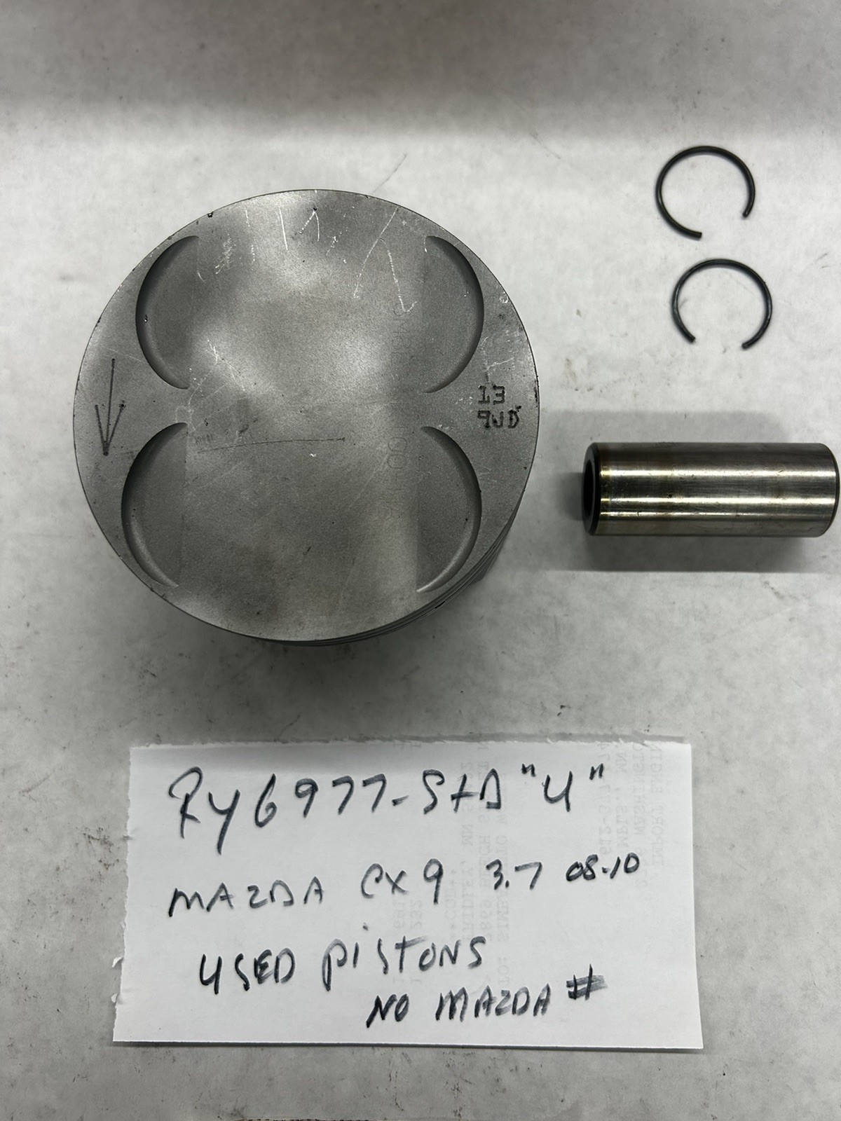 PISTON \*USED\* FITS MAZDA CX9 3726cc V6 DOHC DURATEC 24V 2008-2010 RY6977-STD \*USED\* NO RINGS ALSO FITS SOME FORD PRODUCTS/F150/MKS 3.7 V6 2009-2011 THESE ARE "OE MAZDA PISTONS. MAZDA DOESN'T SELL PISTONS FOR THIS CAR, SHORT BLOCKS ONLY PISTONS WILL NOT COME WITH RINGS, I HAVE SEE 021-6979-STD, CAN SELL SINGLE RING SETS,CALL ME. \*\*ALSO HAVE CONNECTING RODS, SEE CRMA-037\*\* THESE ARE USED PISTONS, MAKE SURE OF YOUR NEEDS, USED PARTS NOT RETURNABLE \*\*\*\*\*\*EVERY PART NUMBER I HAVE LISTED ON MY E-BAY SITE IN ON THE SHELF, NOT DROPPED SHIPPED FROM VENDOR\*\*\*\* \*\*\*PLEASE CHECK PART NUMBER AND APPL. BEFORE ORDERING TO PREVENT PROBLEMS\*\*\*\* \*\*\*\*ANY QUESTIONS,PLEASE CALL\*\*\*\* PLEASE NOTE THAT I USE "ITM" CATALOGING FOR MY PRODUCT,ITM'S PARTS MAY OR MAY NOT BE SHIPPED.