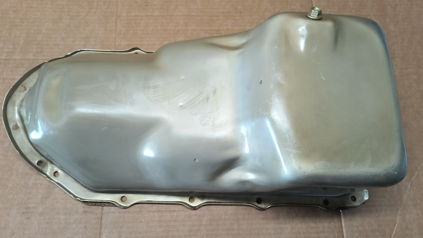 This is an original H-O Racing Specialties Road Race Baffled oil pan with trap door, part number OS-29. This oil pan is new and has never been used. It has some minor imperfections due to being forty years old, moved around and almost installed once, hence the new gasket glued to the pan. These pans were purchased from Pontiac, modified by H-O and then coated with gold "Cad II" anti-corrosion process. This can be painted or left natural. This is a rare opportunity to buy a truely vintage, functional performance part for your "day 2" restoration. Being this is an original factory oil pan it should fit all chassis using the standard V-8 Pontiac pan from 1965-1979. This also features the later designed five crown rear seal to eliminate a possible annoying leak that the earlier designed pans usually had.