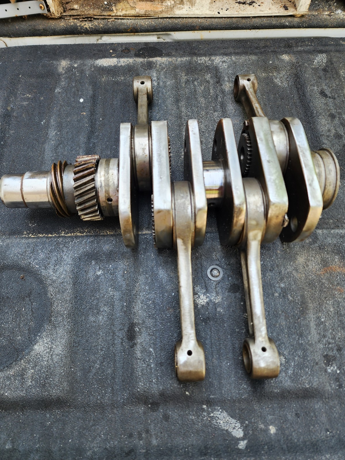 The Porsche 356 SUPER Hirth Roller Bearing Crankshaft with Rods is a high-quality engine part made in Germany. It includes a bearing and is designed to fit the standard main crankshaft of Porsche vehicles. Don't know much about this. Was purchased in a parts lot. Bearings shown do not move freely.