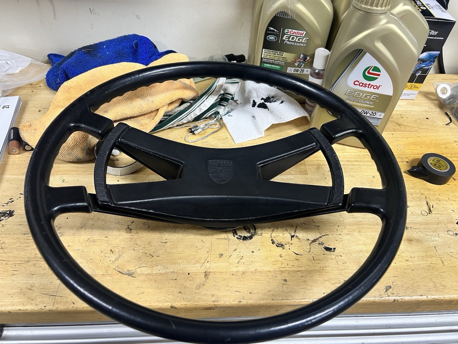 Porsche steering wheel in very good condition with cosmetic dings and pits. No cracks, or parts missing. Does not come with the internal horn button but the main outer horn button is there which is the center piece.