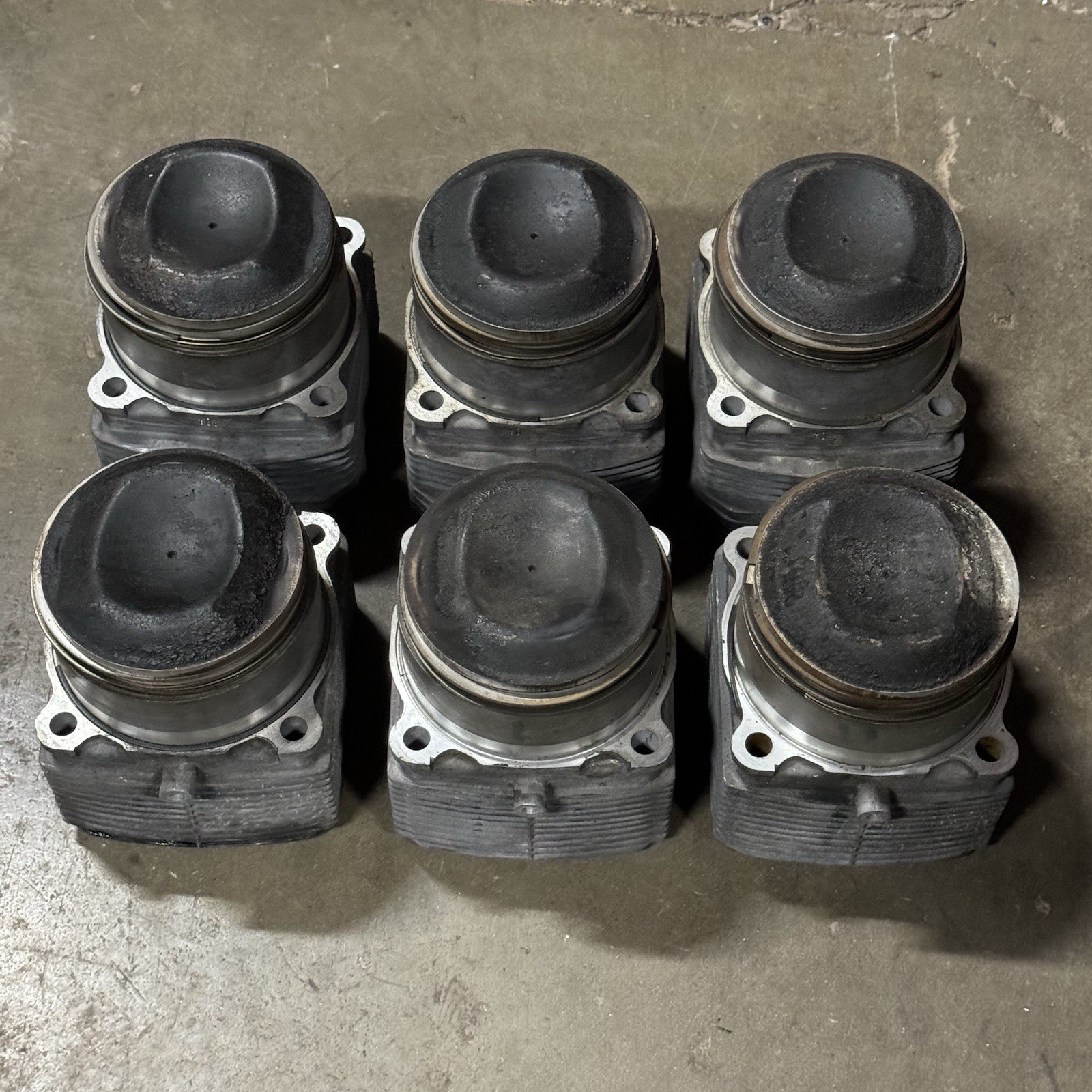 Complete set of pistons and cylinders for Porsche 964. Includes wrist pins and rings. No notable signs of wear or damage. Reportedly removed from a low mileage engine.