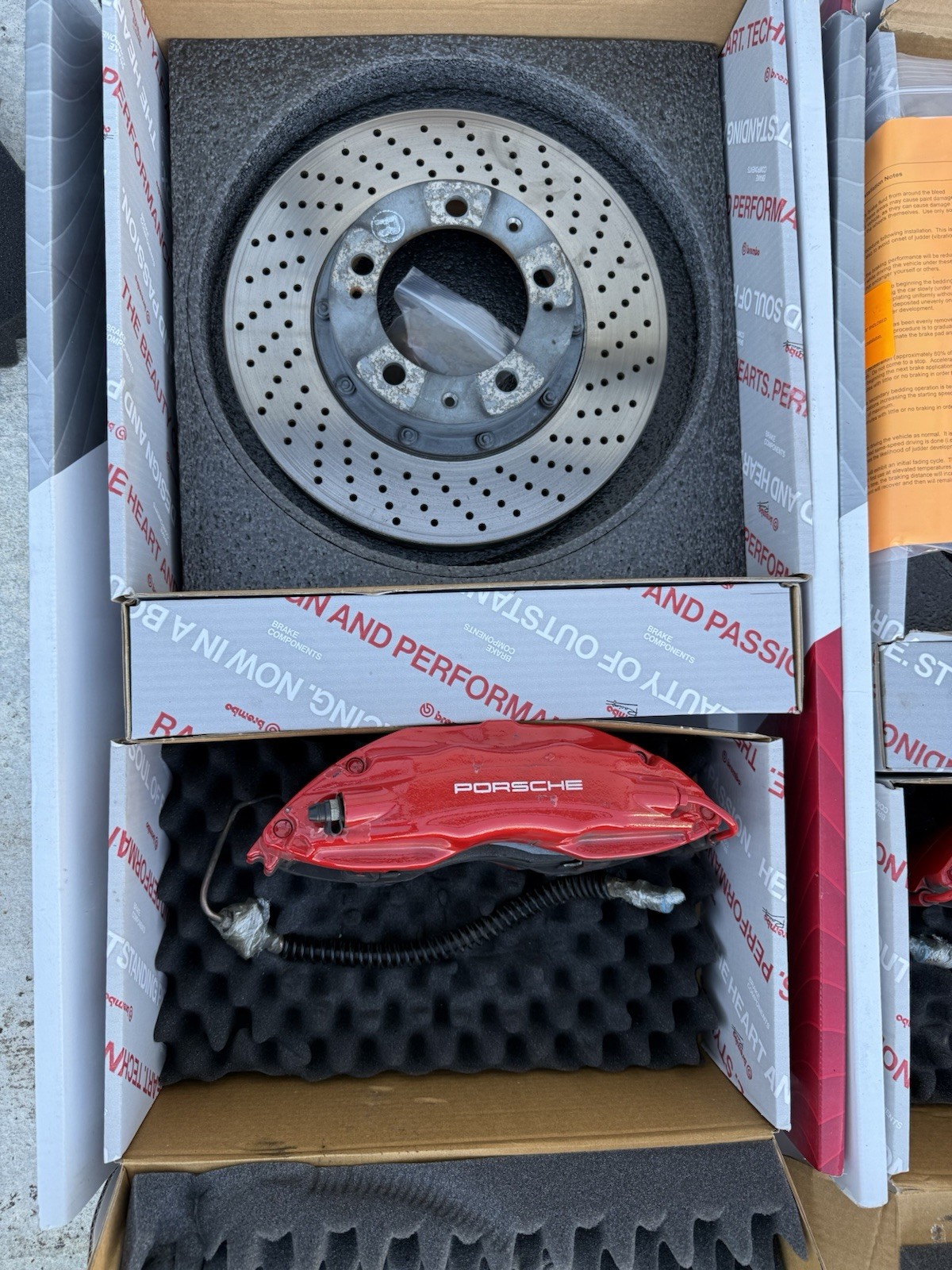 COMES WITH ALL 4 CALIPERS AND ROTORS COMES WITH WHAT IS SHOWN IN PHOTOS JUST NEEDS A CLEANING The product is a set of four Porsche 993 Big Red Calipers, rotor, and pads. It is specifically designed for Porsche vehicles and includes the manufacturer part numbers 99335142510 and 99335142610. These high-quality brake disc rotors and pads are essential for optimal braking performance and safety on the road. The Porsche brand ensures reliability and performance for your vehicle's braking system.