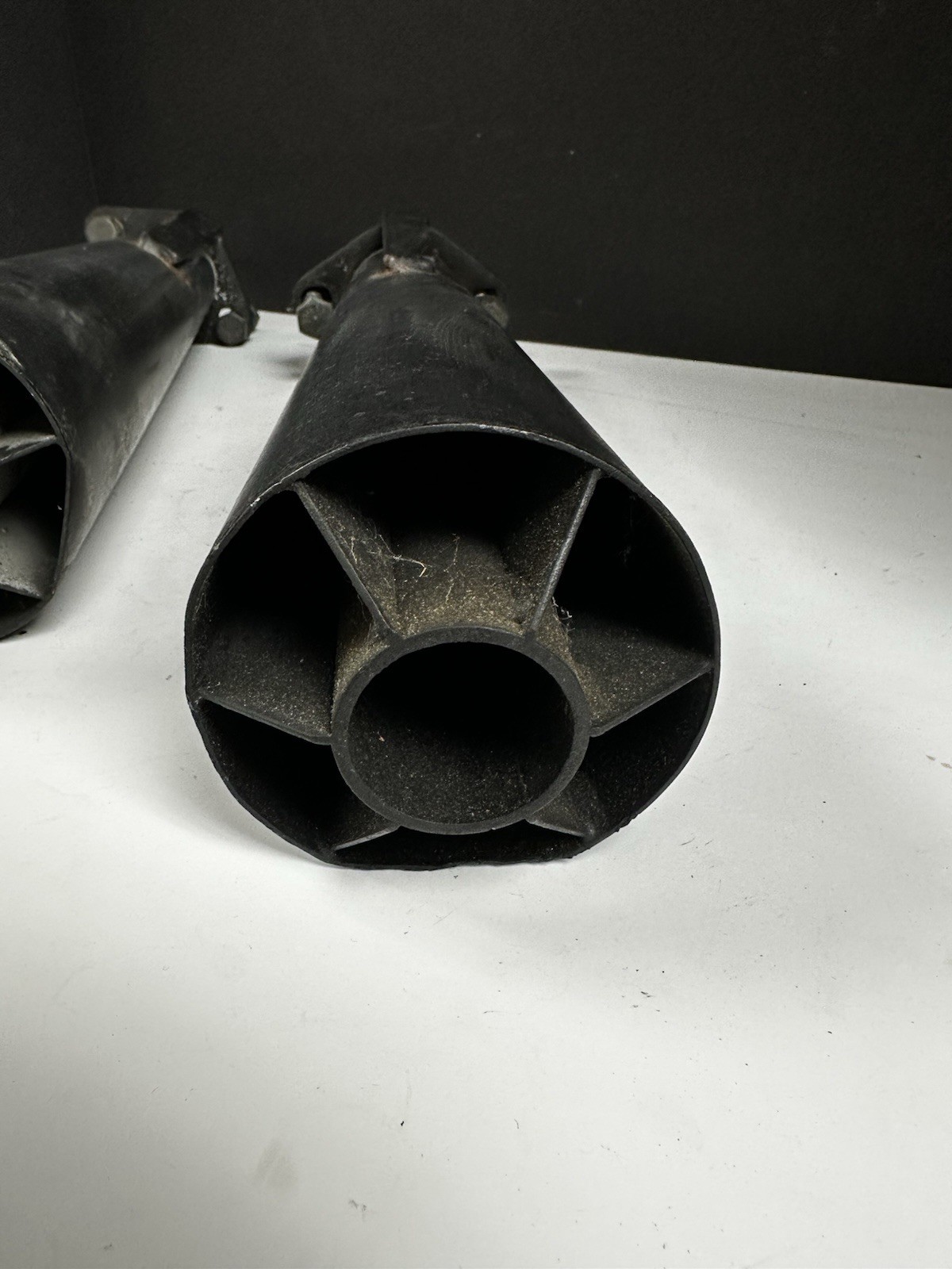 Pair of 13 1/2” Porsche 911 cookie cutter exhaust tips They have some bends at the very edge of the pipes, see pics, easily bend back with tools but I didn’t want to scratch the black finish. Also has some driveway rash. One tip had a dent about half way up, see pics Overall very cool vintage pieces that are getting harder to find.