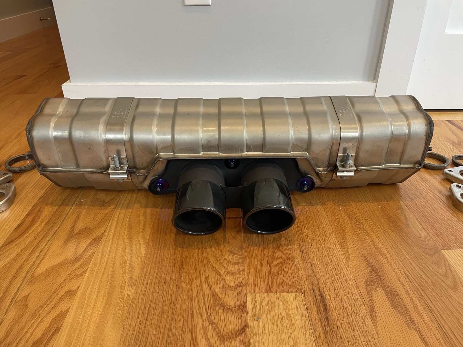 997 / 991 GT3 OEM Stainless Center Muffler & Tips - Low Miles OEM GT3 stainless steel center muffler with tips. Taken off a 997 GT3 with ultra low miles and stored ever since. Basically new, I'd eat off this thing! Even the original stickers are on the muffler, so it was probably never heat cycled. All side studs are perfect. Titanium tip hardware. Compatible with various models: 997.1 GT3 / GT3 RS, 997.2 GT3, 991.1 GT3, 991.2 GT3 / GT3 RS, 911 R, Speedster, GT2 RS (See the last photo in the gallery for all compatible models).
