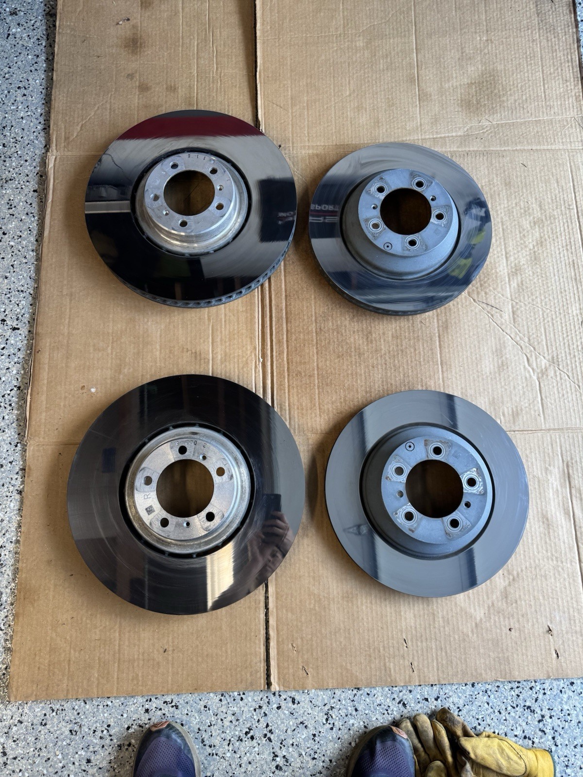 Full Porsche surface coated brake set. Rotors, calipers, pads. Parts are from a 2019 Cayenne Turbo with 28k miles on them. Buyer to confirm fitment, but these should fit all 2019+ Cayenne SUV and Taycan. These are the brakes that produce minimal to almost no brake dust. That is why Porsche offers them with white painted calipers. Shipping estimate is for one box. The full set will require two boxes at the current estimate.