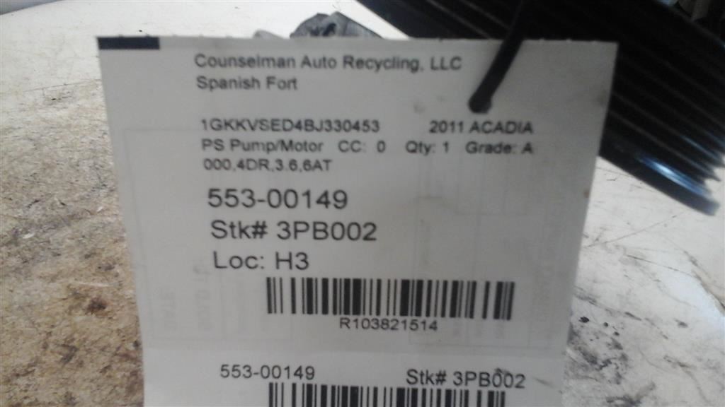 Power Steering Pump VIN J 11th Digit Limited Fits 07-17 ACADIA 103821514 ### **This part requires VIN (Vehicle Identification Number) verification prior to shipping.** ### Please send VIN prior to purchase, or include in your purchase notes. If not, VIN will be requested after purchase, prior to shipping the order. Without VIN verification, orders are subject to seller cancellation. We answer all questions promptly during regular business hours. Monday through Friday 7am-5pm Central Time. **-** **Our Promise** ### Our Promise is that you are completely satisfied with every part you buy from Counselman Auto Recycling ### If you have a problem with the part, changed your mind or the part does not fit, simply let us know. If you need help with how to return an item, send us a message. We are here to help. **-** **Shipping Information** ### This part willl ship with Fedex or USPS with live tracking information. -