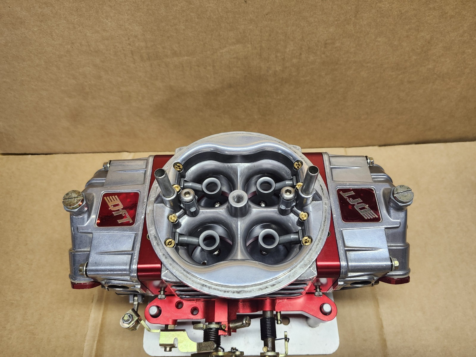 This is a used NWR Carbs Modified Quick Fuel Q-750 Drag Race 4150 Carburetor for gas. It is meant for 450+ HP applications. This carburetor has made over one hundred 1/4 mile passes It features Quick Fuel Q-750 Main Body with improved Venturi air inlets for more flow and more responsive boosters for better signal. It has been modified and fitted for 850 baseplate and gasket. With Adjustable Air Bleeds NWR Modified QF Billet Aluminum Metering Blocks 4 Adjustable Emulsion Channels- Race calibrated- Adjustable idle feed and Powervalve feed. Primary 4.5 Powervalve and Secondary Powervalve Blockoff NWR Modified ProBillet Aluminum 850 Double Pumper Baseplate - High Flow 1.75 in Throttle Plates for more torque- 1:1 Throttle Linkage -Secondary idle adjustment QF Aluminum Fuel Bowls with sightglass Nitrophyl Double Notched Float with Jet extensions in the secondary. High Flow .130 Needle/Seat and 30cc Accel Pumps Fully tested on our drag car. Specs Primary Jet 74 Secondary Jet 84 Accelerator Pump Nozzle 37 Pump Cams Pink Idle Feed Restrictor 38 Idle Air Bleeds 70 High Speed Air Bleed 34 Venturi size. 1.39 in Throttle Bore 1.75 in
