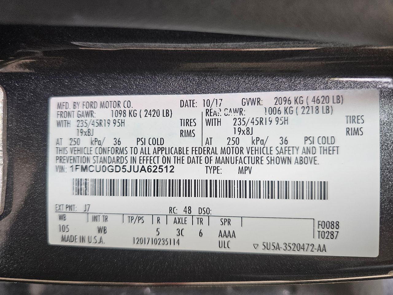 - VIN #: 1FMCU0GD5JUA62512
